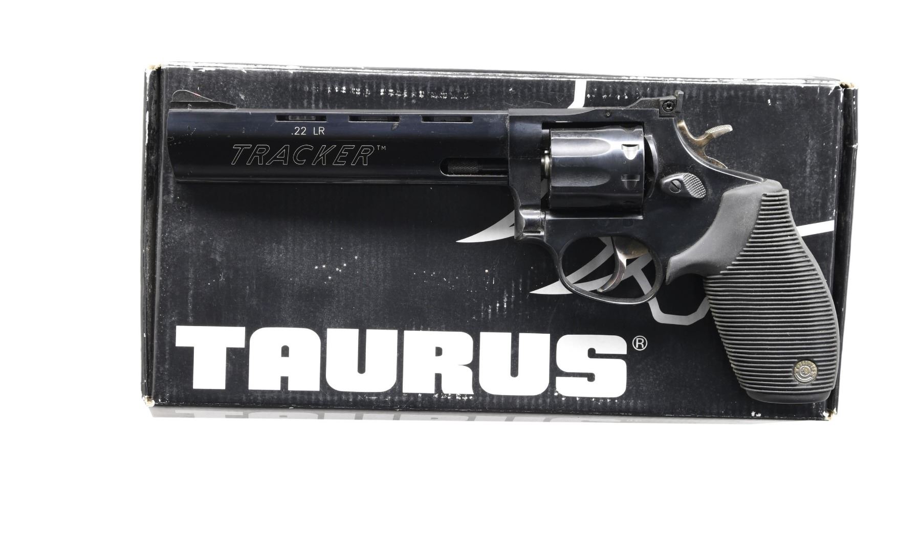 WITH MATCHING FACTORY BOX. Cal. .22 LR. S# DW304026. This Taurus Model 990 Tracker features a blued finish with a 6.625-inch barrel, adjustable rear sight, and ramp front sight with red insert. The frame is a large-frame configuration, and the cylinder is fluted, holding nine rounds. The grips are ribbed rubber with a Taurus medallion. UNATTACHED ACCESSORIES: Factory box. CONDITION: Overall condition is near excellent with approximately 95% of the original blued finish remaining on the barrel and frame showing scattered light marks. The grips are in excellent condition with no visible wear. The bore is bright with sharp rifling. MODERN (24-4433/MD) $400-600.