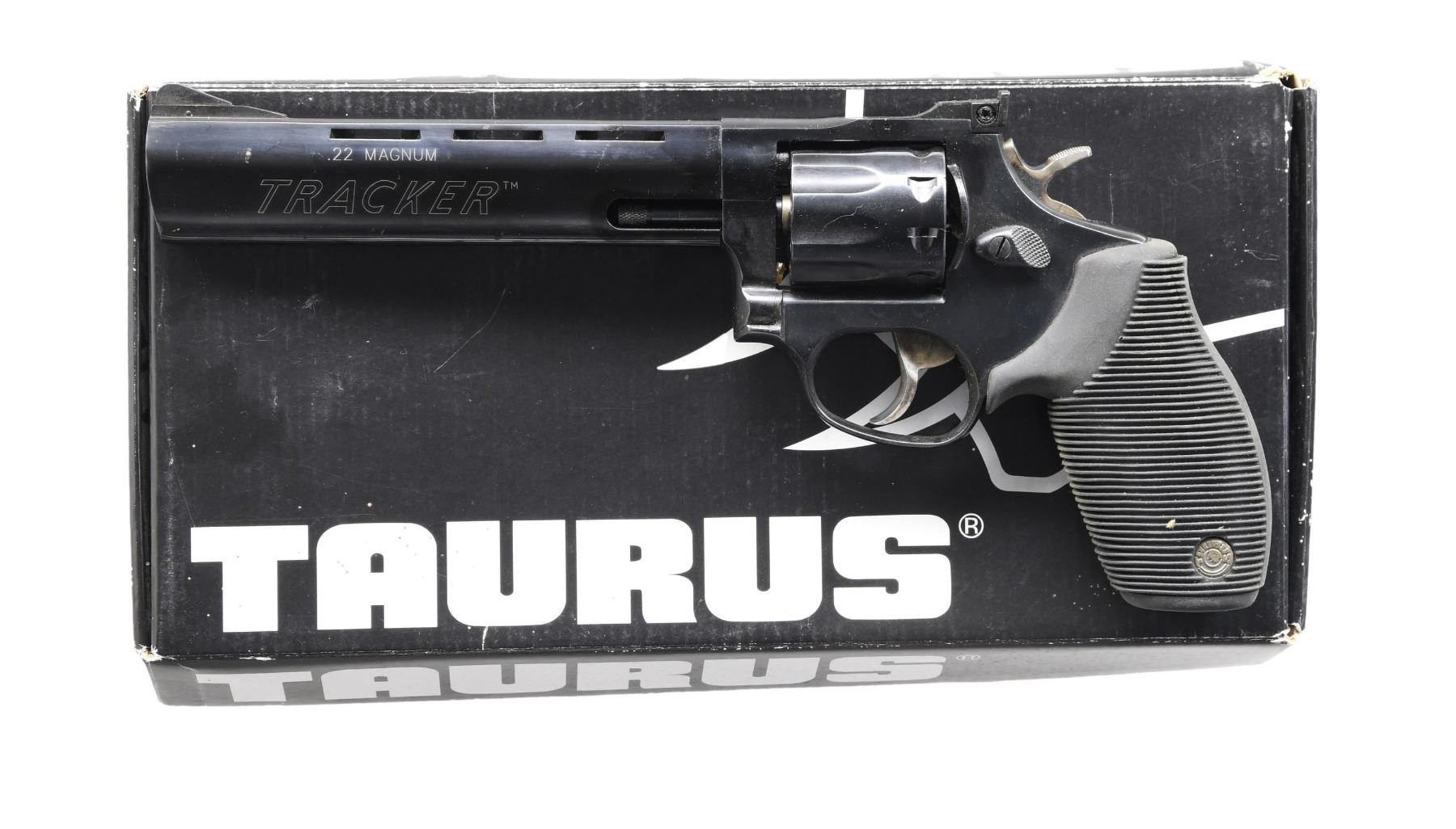 WITH MATCHING FACTORY BOX. Cal. .22 Mag. S# DU285052. This Taurus Model 991 Tracker features a blued finish with a 6.625" barrel, adjustable rear sight, and ramp front sight with red insert. The frame is a large-frame configuration and the cylinder is fluted, holding nine rounds. The grips are ribbed rubber with a Taurus medallion. UNATTACHED ACCESSORIES: factory box. CONDITION: overall condition is very good, with approximately 95% of the original blued finish remaining on the barrel and frame, with scattered light oxidation and marks. The grips are in excellent condition with no visible wear. The bore is bright with sharp rifling. (24-4455/MD). MODERN. $300-400.