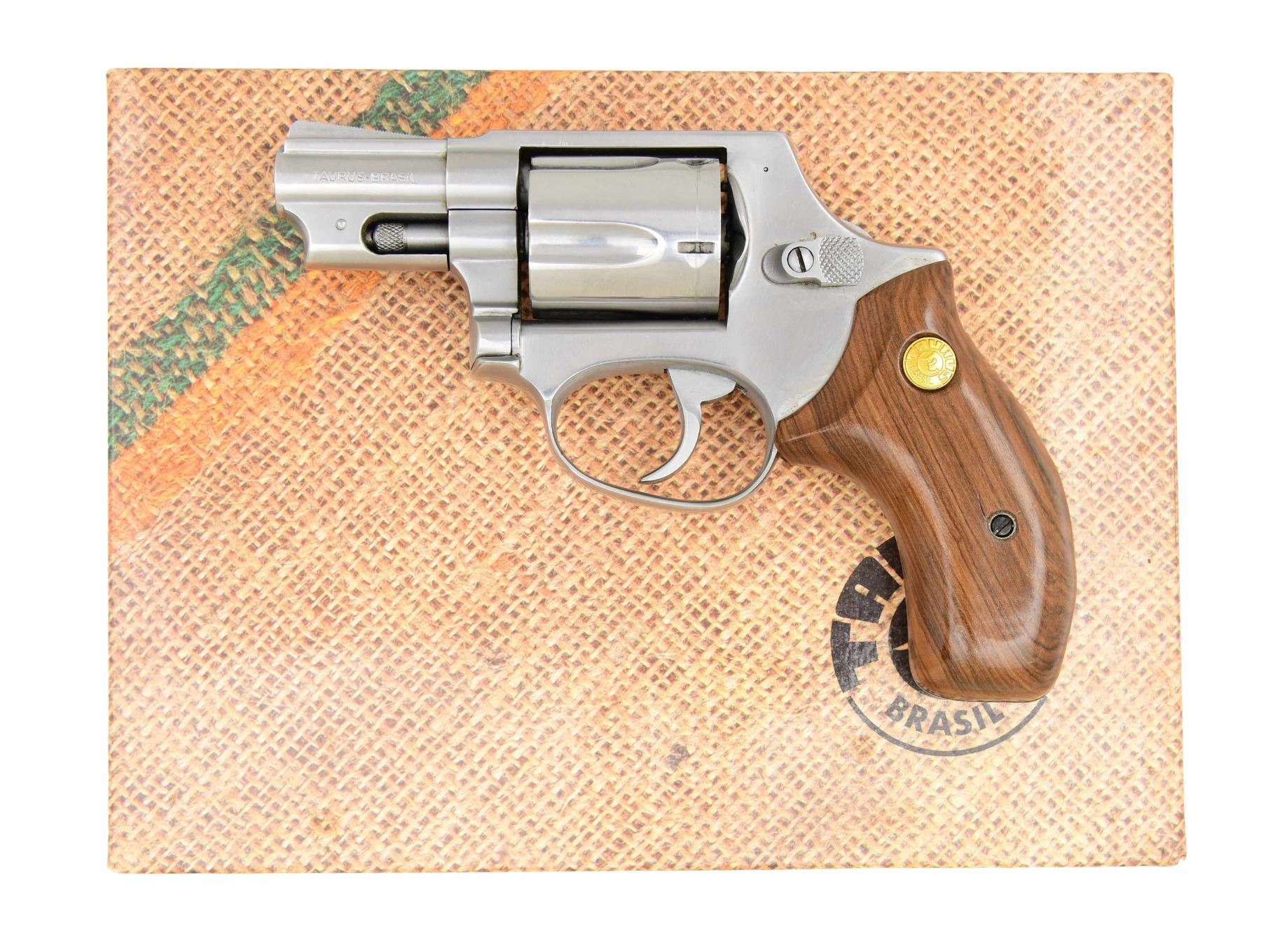 Cal. 38 Spl. S# GL85287. Bbl. 2". Ramped, serrated blade front sight with added yellow paint. Fixed rear sight. Five-shot cyl. and shrouded hammer. Stainless finish. Smooth hardwood grips with gold Taurus medallions. UNATTACHED ACCESSORIES: matching numbered factory box with manual, paperwork, and set of rubber Pachmayr Compac grips. CONDITION: grips show a light chip at front of right panel; grips otherwise show some scattered light handling marks. Metal shows some handling marks and operational wear. Action appears to function properly when hand-cycled. Very good bore. (24-3808/MJC). MODERN. $250-350.