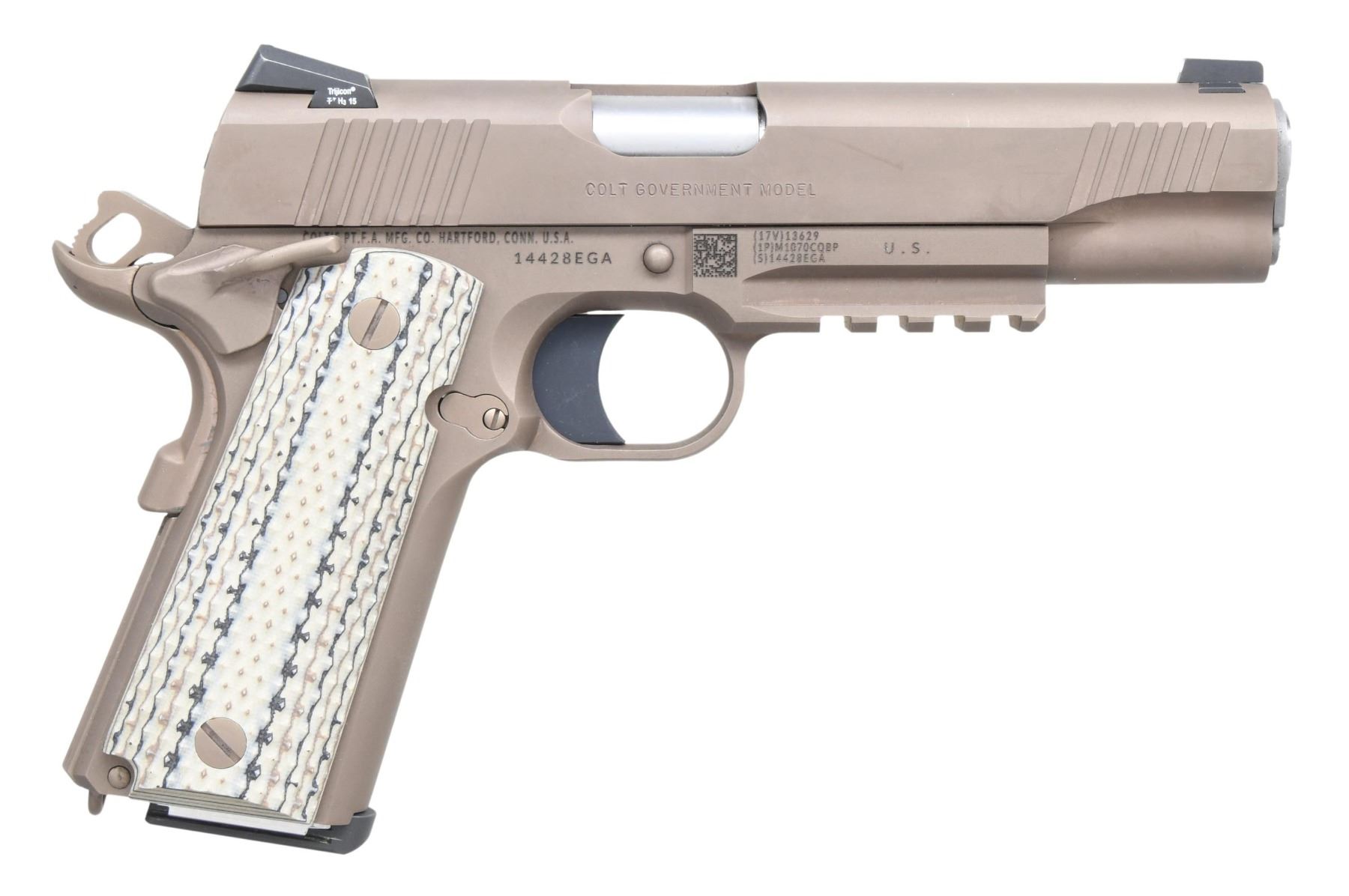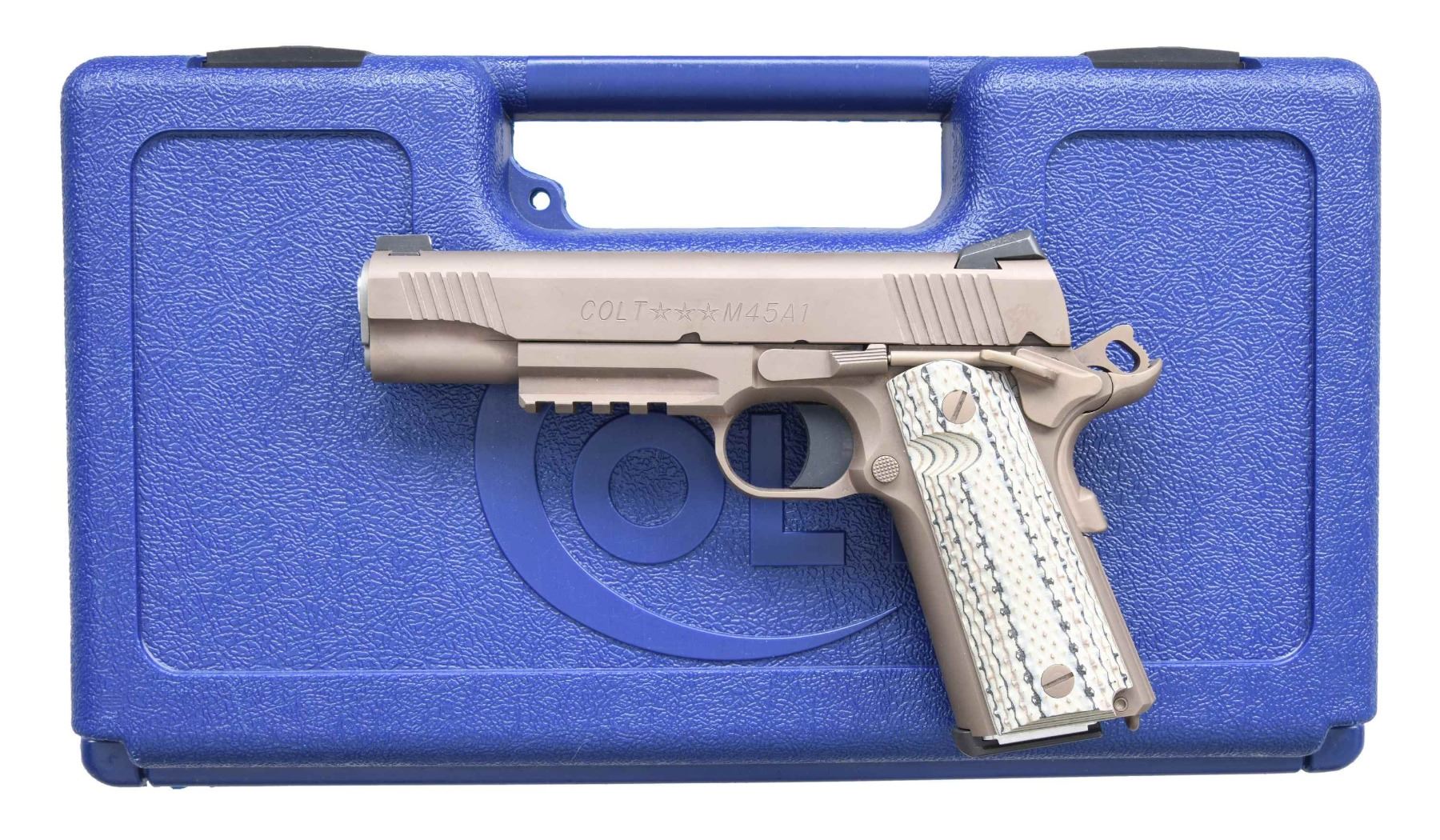 AUTO PISTOL WITH MATCHING FACTORY CASE. Cal. 45 ACP. S# 11428EGA. National Match stainless steel 5" barrel. Trijicon Novak three dot sights. Zinc Brown Ion Bond finish. Underside of frame has a MIL-STD 1913 accessory rail. Desert G10 grips. MAGS: 2 Detachable 8 rd. UNATTACHED ACCESSORIES: matching factory Model 01070M45 case with lock & paperwork. CONDITION: all aspects near excellent. (24-6431/MD). MODERN. $800-1200.