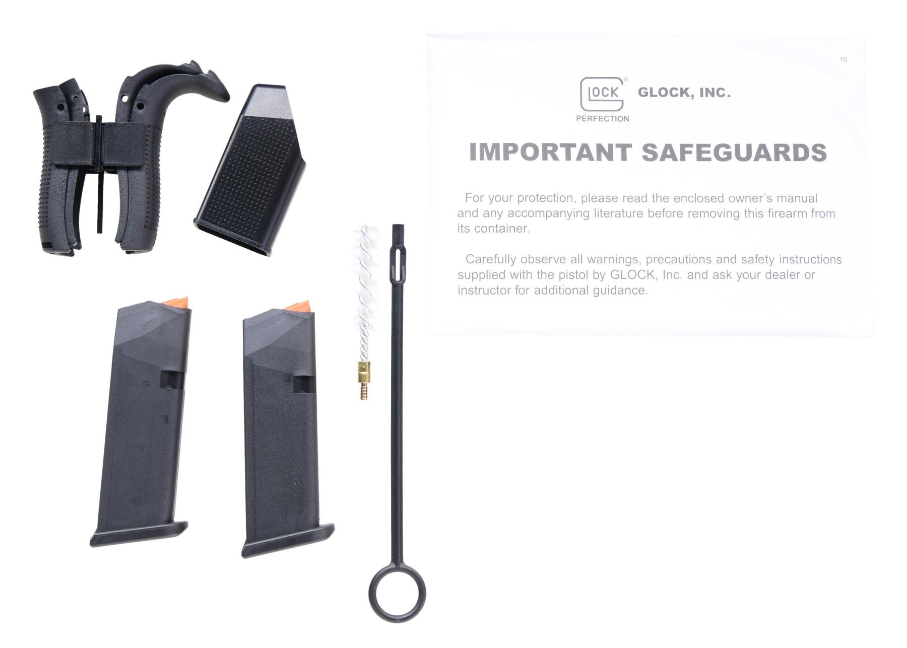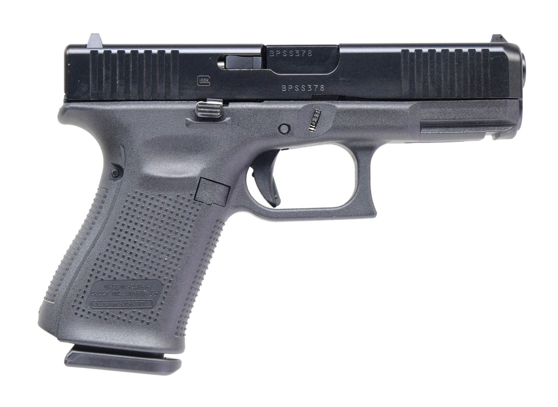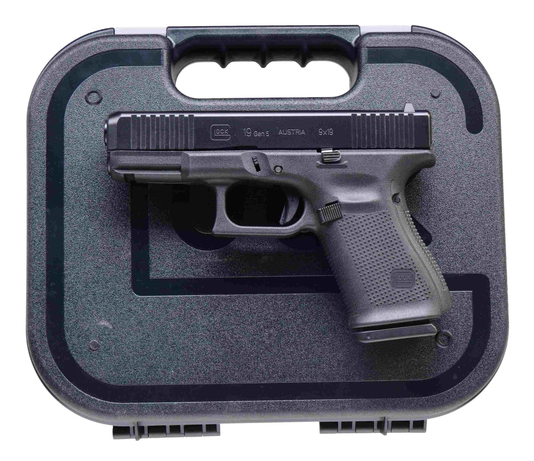 Cal. 9x19. S# BPSS378. This Glock Model 19 Gen 5 features a black polymer frame with a matte black slide. It has a 4.02" barrel with fixed white dot front and rear sights. The frame includes a left-side thumb safety and a left-side magazine release. MAGS: three 15 Rds. UNATTACHED ACCESSORIES: factory box, backstraps, speed loader, cleaning rod, brush, and manual. CONDITION: overall near excellent condition. The slide retains approximately 98% of its original finish. The frame shows minimal wear. The bore is bright with sharp rifling. PROVENANCE: the collection of Gun Sport Ltd., owned by Jon R. Thomas. (23-4019/MD). MODERN. $300-$500.
