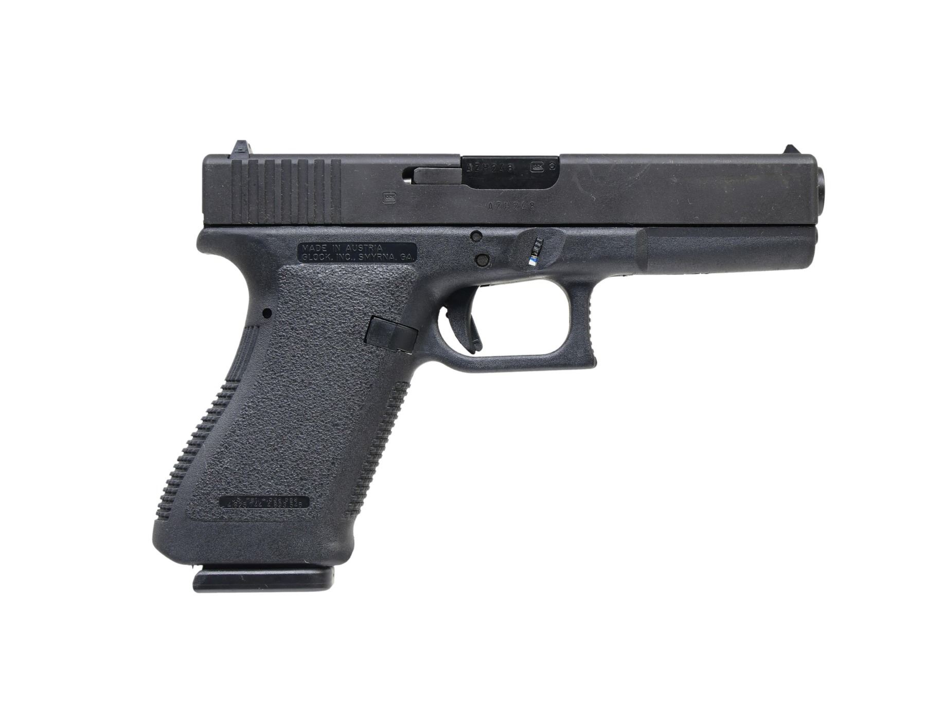 Cal. 10mm. S# AZH248US. Bbl. 4.61". Standard model with matte black finish. Fixed front sight and fixed rear sight. Standard polymer frame with left-side slide release and magazine release. MAGS: two 15 Rds. UNATTACHED ACCESSORIES: factory "tubberware" box, paperwork, cleaning brush, and magazine loader. CONDITION: near excellent overall condition, with approx. 98% original finish remaining on the slide. Bore is bright with strong rifling. PROVENANCE: from the lifelong collection of Terrence McCarty. (24-166/MD). MODERN. $300-$500.