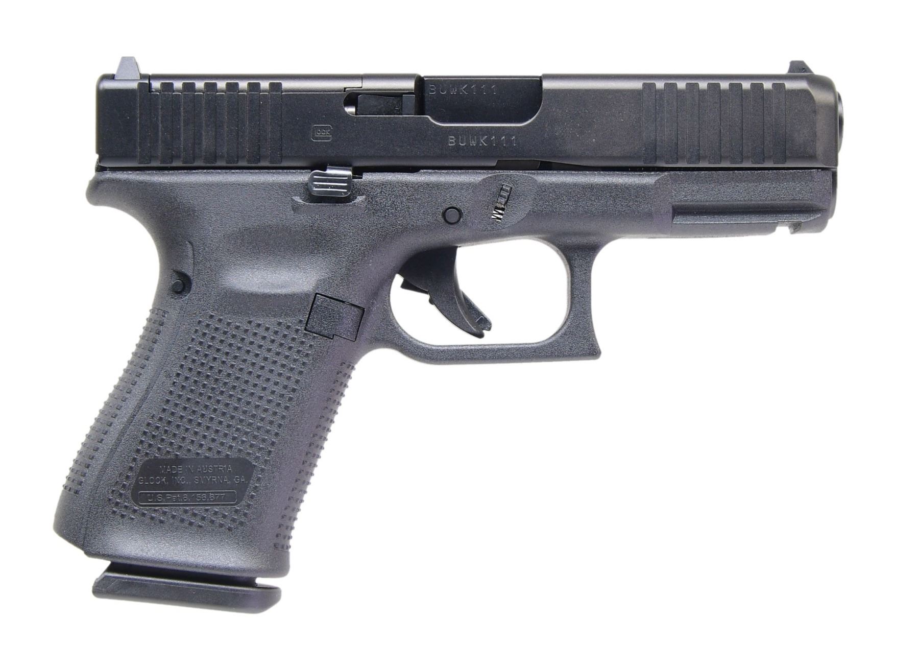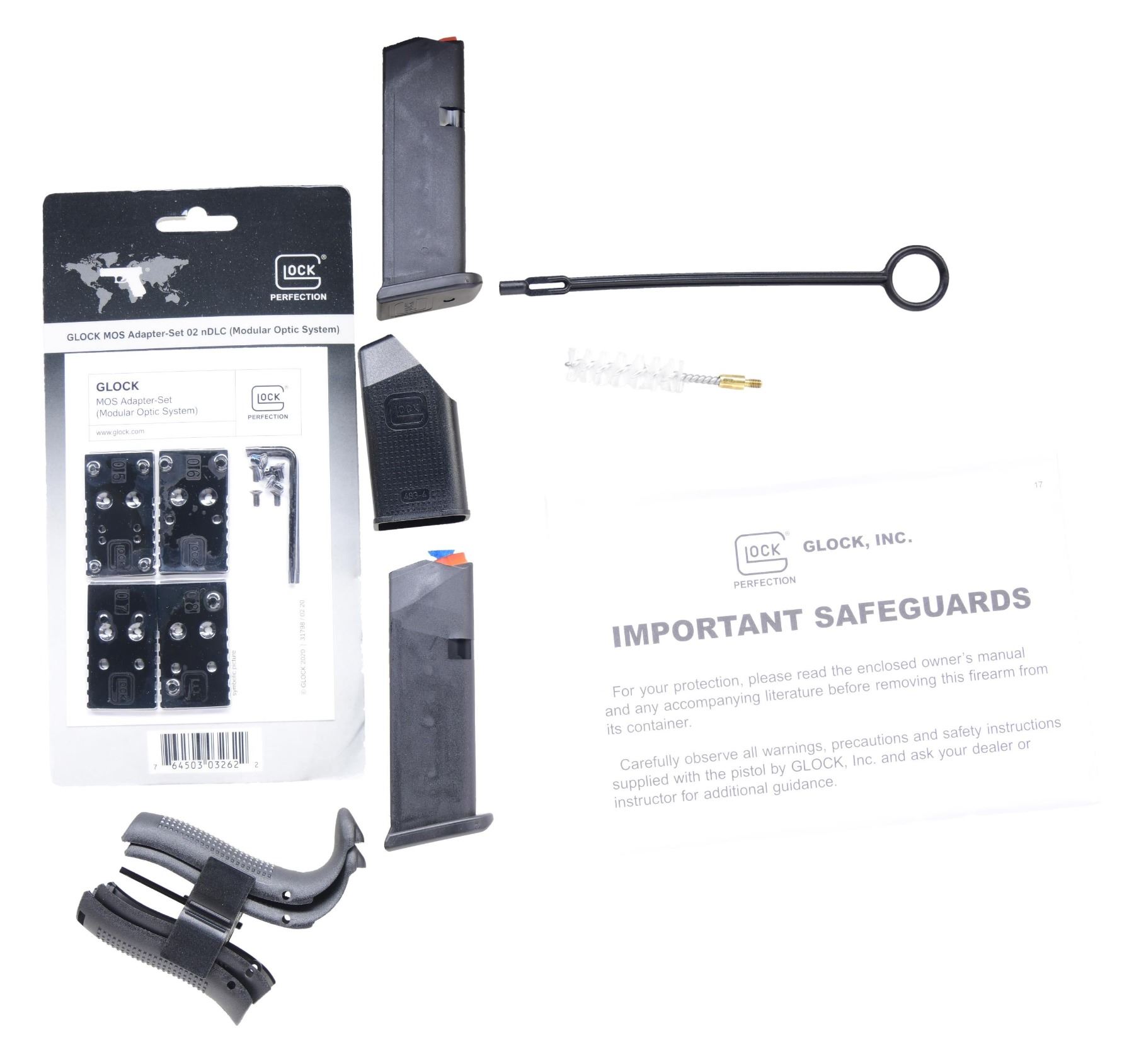 Cal. 40 S&W. S# BUWK111. This Glock 23 Gen 5 model features a matte black finish. The barrel length is 4.02"; it is equipped with a fixed front sight and a rear square notch sight. The frame has the safety integrated into the trigger and the magazine release on the left side. MAGS: three 13 Rds. UNATTACHED ACCESSORIES: factory box, manual, extra backstraps, and MOS adapter set. CONDITION: overall near excellent. The slide retains about 95% of its original finish. The frame is in near excellent condition with minimal wear. The bore is bright with sharp rifling. PROVENANCE: the collection of Gun Sport Ltd., owned by Jon R. Thomas. (23-3143/MD). MODERN. $350-$500.