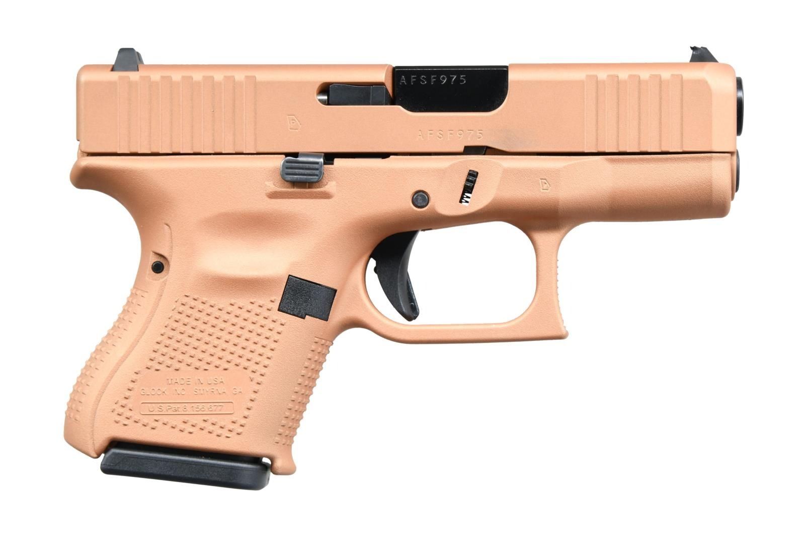 Cal. 9x19. S# AFSF975. Bbl. 3 1/2". Standard white outline Glock sights. USA made Gen 5 Glock 26. Bronze finish. Polymer frame. MAGS: 3-10 rd. UNATTACHED ACCESSORIES: matching numbered factory hardcase w/ four black grip straps, manual, bore brush, cleaning rod, cable lock, & mag loader. CONDITION: all aspects near excellent. PROVENANCE: the Collection of Gun Sport Ltd owned by Jon R. Thomas. (23-2872/MJC). MODERN. $350-550.