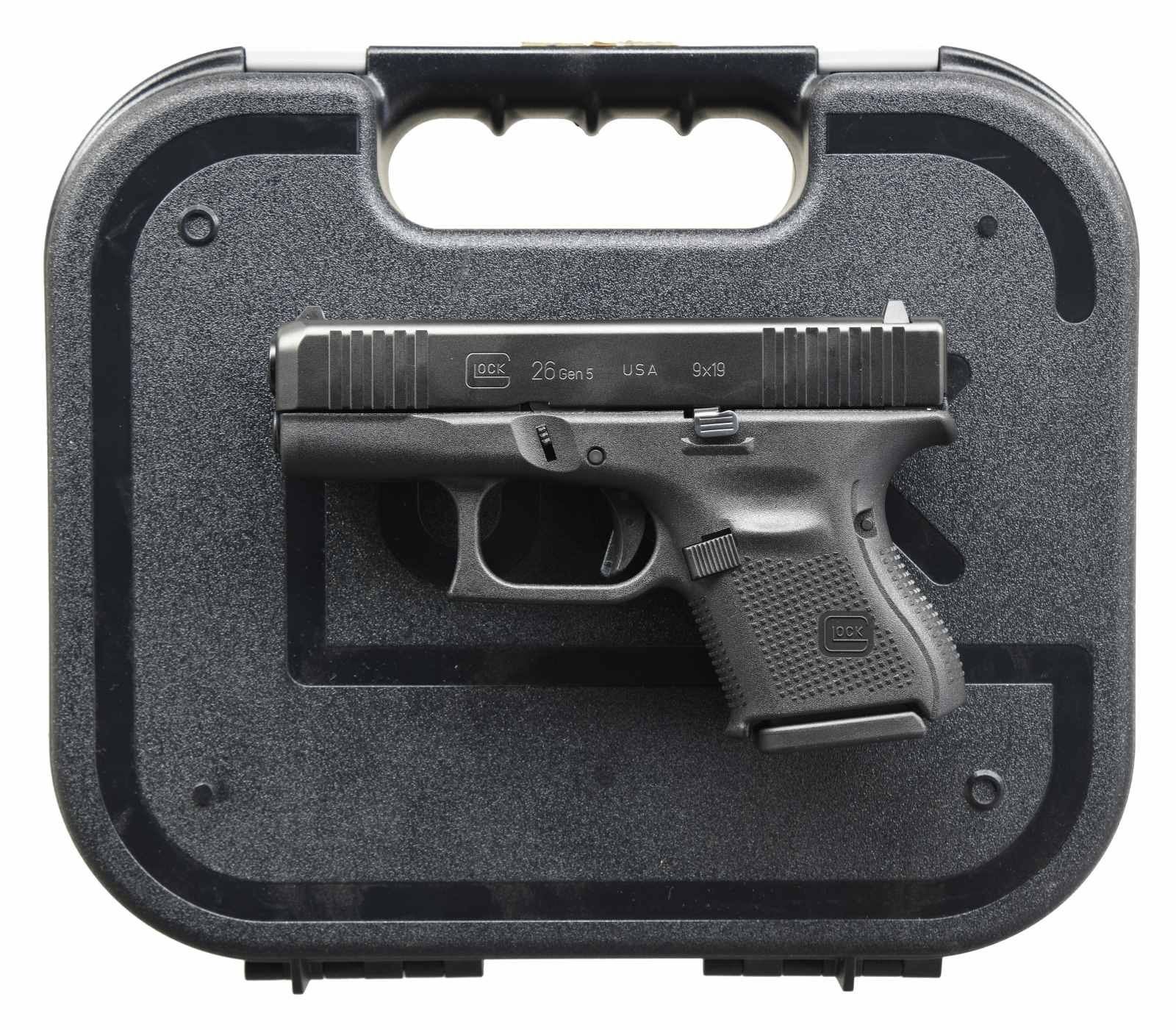 Cal. 9x19. S# AGGA181. Bbl. 3 1/2". Standard white outline Glock sights. USA made Gen 5 Glock 26. Matte black finish. Polymer frame. MAGS: 3-10 rd. UNATTACHED ACCESSORIES: matching numbered factory hardcase w/ two grip straps, manual, bore brush, cleaning rod, cable lock, & mag loader. CONDITION: all aspects near excellent. PROVENANCE: the Collection of Gun Sport Ltd owned by Jon R. Thomas. (23-2873/MJC). MODERN. $300-500.