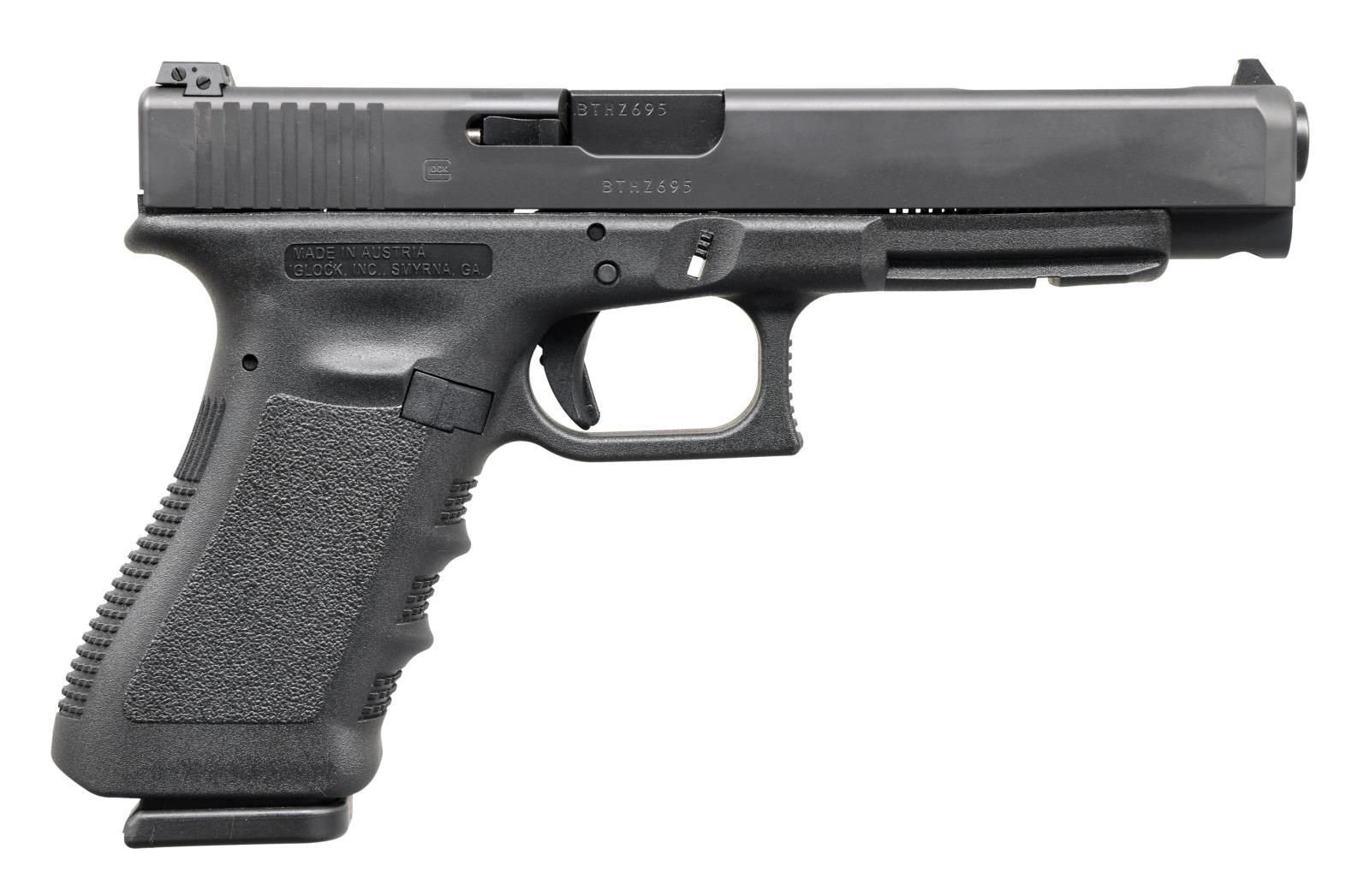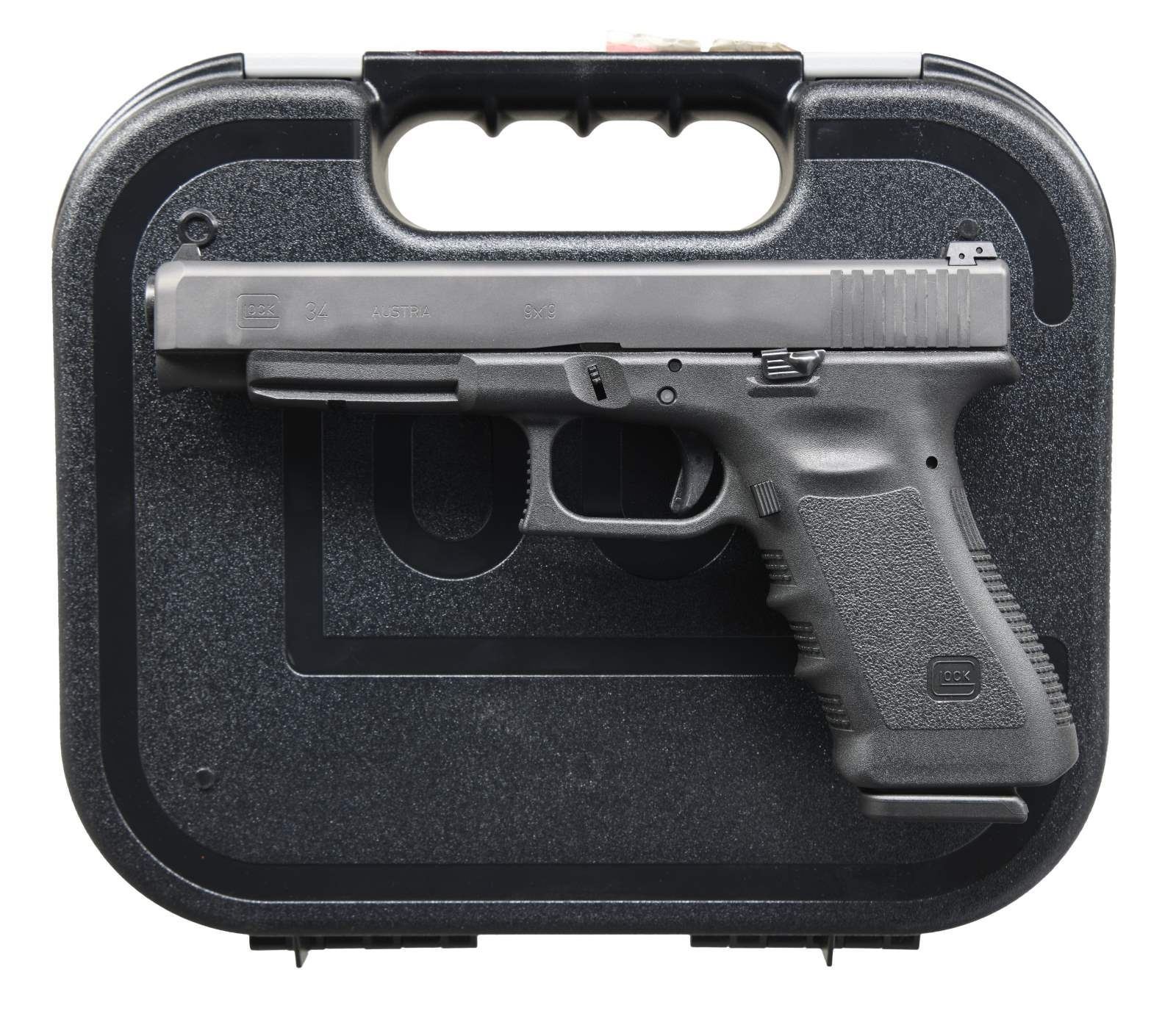 Cal. 9mm Luger. S# BTHZ695. Bbl. 5 1/3". White outline Glock sights with adjustable rear. Gen 3 Glock 34. Matte black finish. Black polymer frame with accessory rail. MAGS: two 17 rd. UNATTACHED ACCESSORIES: matching numbered factory hardcase with mag. loader, cable lock, manual, and cleaning rod. CONDITION: all aspects are near new; in the box. PROVENANCE: from the collection of Gun Sport Ltd., owned by Jon R. Thomas. (23-4622/MJC). MODERN. $300-500.