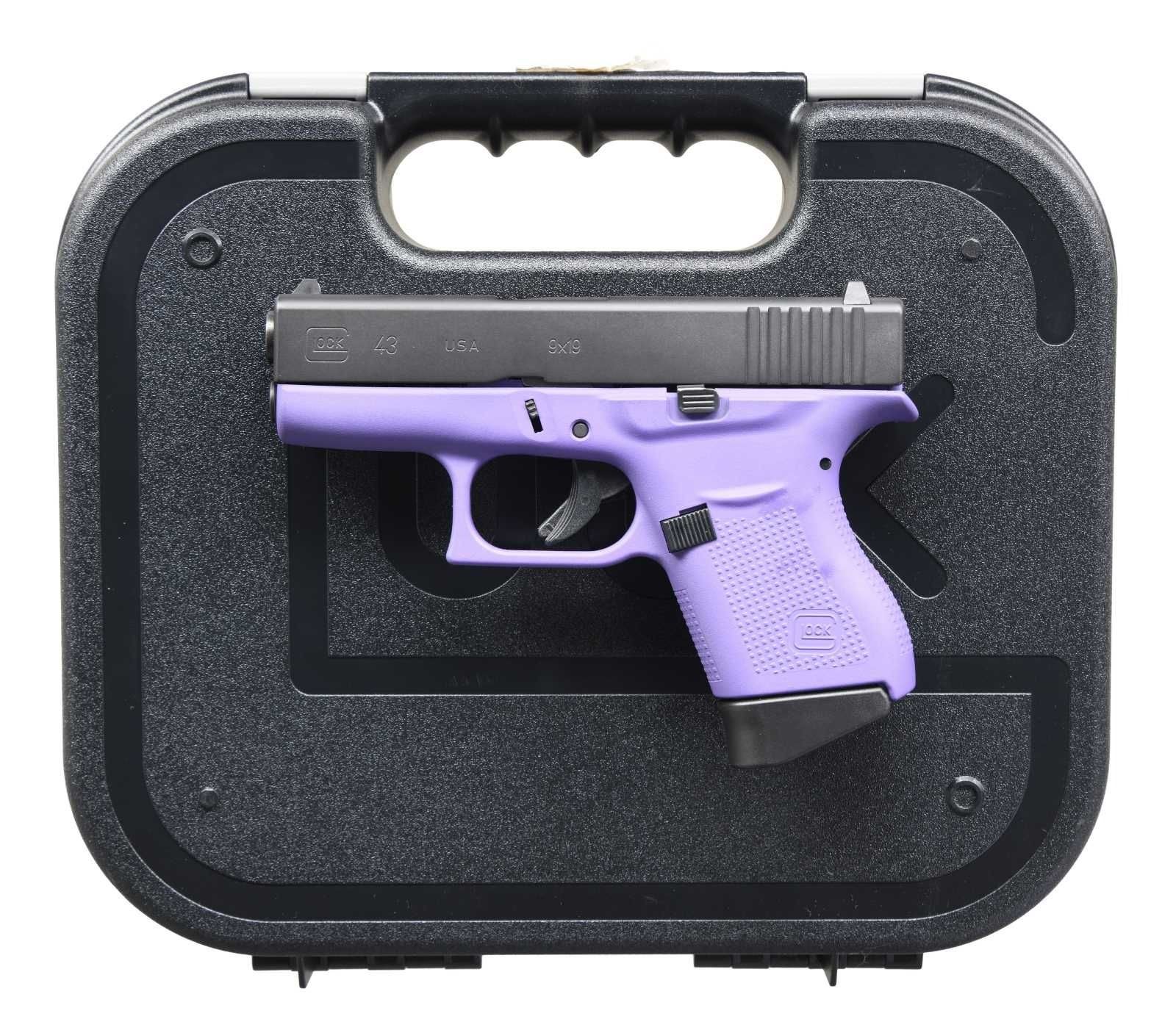 Cal. 9mm Luger. S# AGMS897. Bbl. 3 1/2". Standard white outline Glock sights. Professionally finished by Apollo Custom Inc. with matte black slide. Purple-finished polymer frame. MAGS: two 6 rd. UNATTACHED ACCESSORIES: matching-numbered factory box with cable lock, mag-loader, manual, and cleaning rod. CONDITION: all aspects are near excellent. PROVENANCE: from the collection of Gun Sport Ltd., owned by Jon R. Thomas. (23-4286/MJC). MODERN. $500-700.