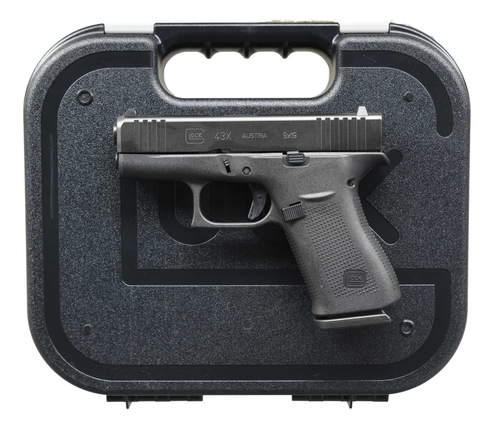 Cal. 9x19. S# BUEK883. Bbl. 3 1/2". Standard white outline Glock sights. Austrian made Glock 43X pistol. Matte black finish. Polymer frame. MAGS: 2-10 rd. UNATTACHED ACCESSORIES: matching numbered factory hardcase w/ cable lock, cleaning rod, manual, & mag loader. CONDITION: all aspects near excellent. PROVENANCE: the Collection of Gun Sport Ltd owned by Jon R. Thomas. (23-3096/MJC). MODERN. $300-500.