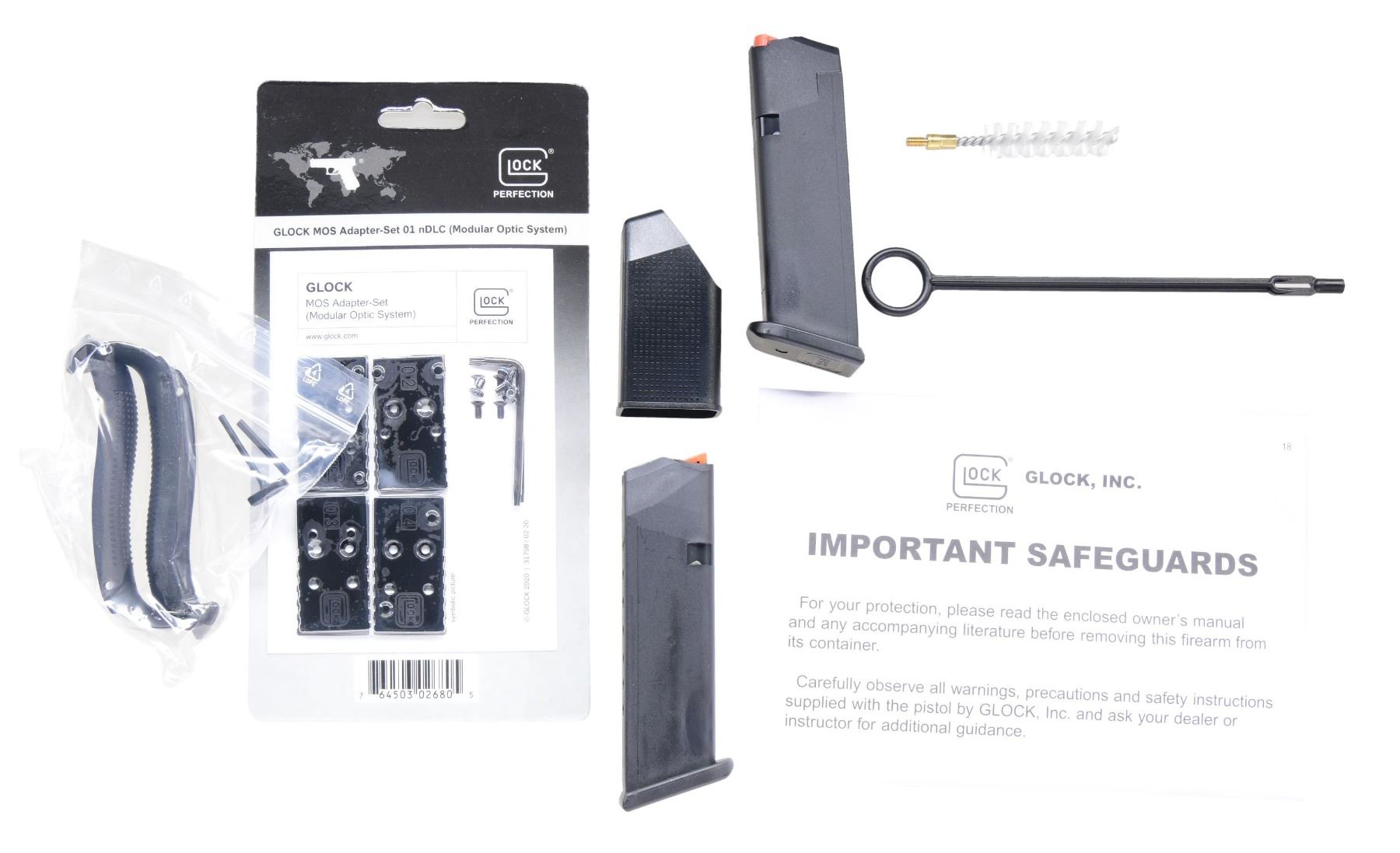Cal. 9x19. S# BVMZ578. This Glock 45 model features a matte black finish. The barrel length is 4.02"; it is equipped with a fixed front sight and a rear square notch sight. The frame has the safety integrated into the trigger and the magazine release on the left side. MAGS: three 17 Rds. UNATTACHED ACCESSORIES: factory box, manual, extra backstraps, and MOS adapter set. CONDITION: overall near excellent. The slide retains about 95% of its original finish. The frame is in near excellent condition with minimal wear. The bore is bright with sharp rifling. PROVENANCE: the collection of Gun Sport Ltd., owned by Jon R. Thomas. (23-3136/MD). MODERN. $350-$500.