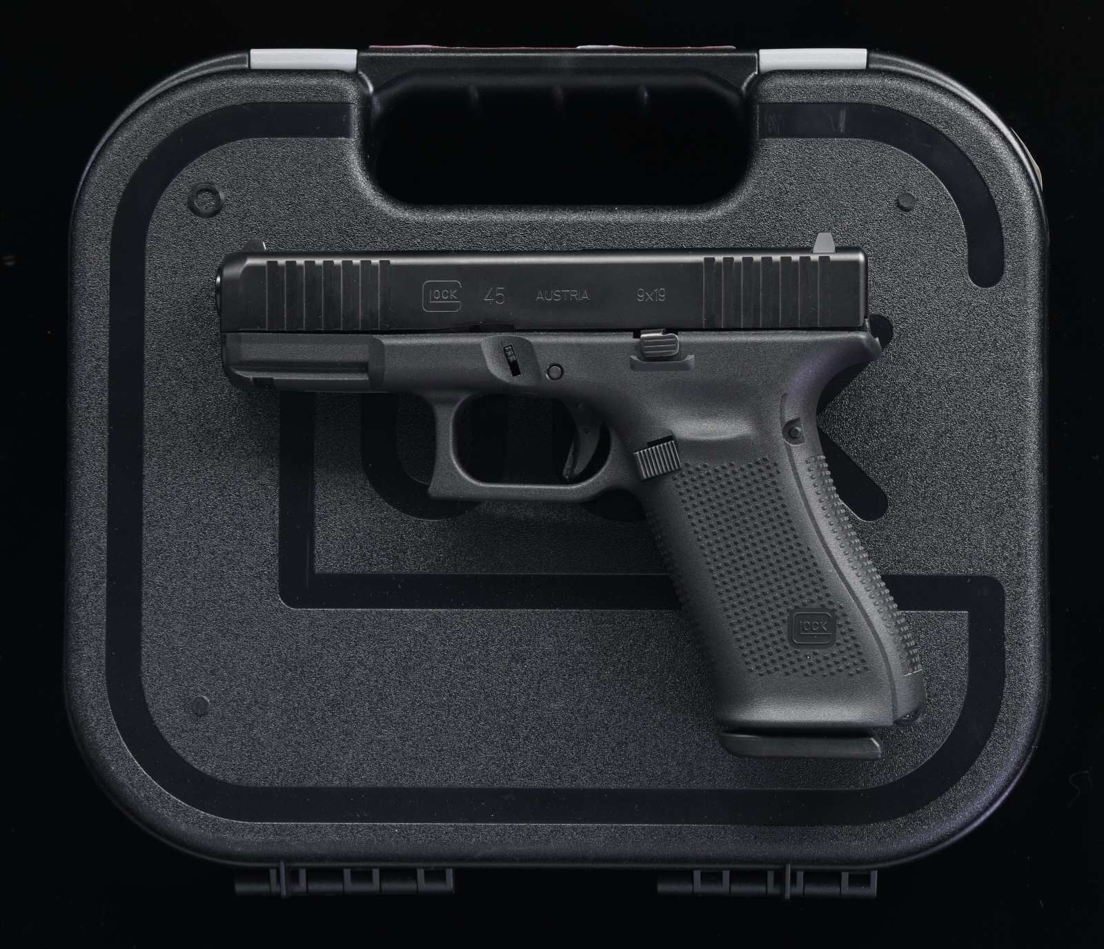 Cal. 9x19. S# BPHU691. Bbl. 4". Standard white outline Glock sights. USA-made Glock 45 pistol Matte black finish. Slide has front and rear serrations. Polymer frame with accessory rail. MAGS: three 17 rd. UNATTACHED ACCESSORIES: matching numbered factory hardcase with four grip straps, manual, paperwork, cable lock, bore brush, cleaning rod, and mag-loader. CONDITION: all aspects are near new in the box. PROVENANCE: from the collection of Gun Sport Ltd., owned by Jon R. Thomas. (23-4028/MJC). MODERN. $350-550.