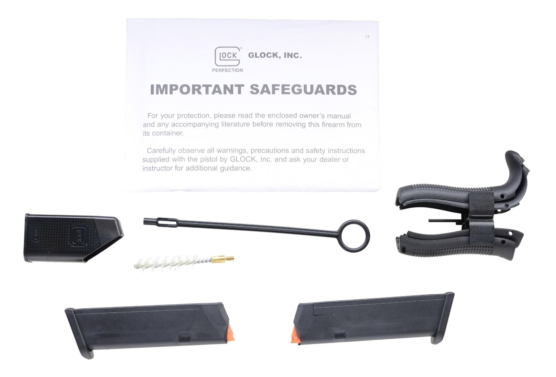 Cal. 9mm Luger. S# AFPY391. This Glock Model 45 Gen 5 features a black polymer frame with a factory FDE (Flat Dark Earth) finish on the slide. It has a 4.02" barrel with fixed white dot front and rear sights. The frame includes a left-side slide release and a left-side magazine release. MAGS: three 17 Rds. UNATTACHED ACCESSORIES: factory box, backstraps, speed loader, cleaning rod, brush, and manual. CONDITION: overall near excellent condition. The slide retains approximately 98% of its original finish. The frame shows minimal wear. The bore is bright with sharp rifling. PROVENANCE: the collection of Gun Sport Ltd., owned by Jon R. Thomas. (23-4623/MD). MODERN. $300-$500.