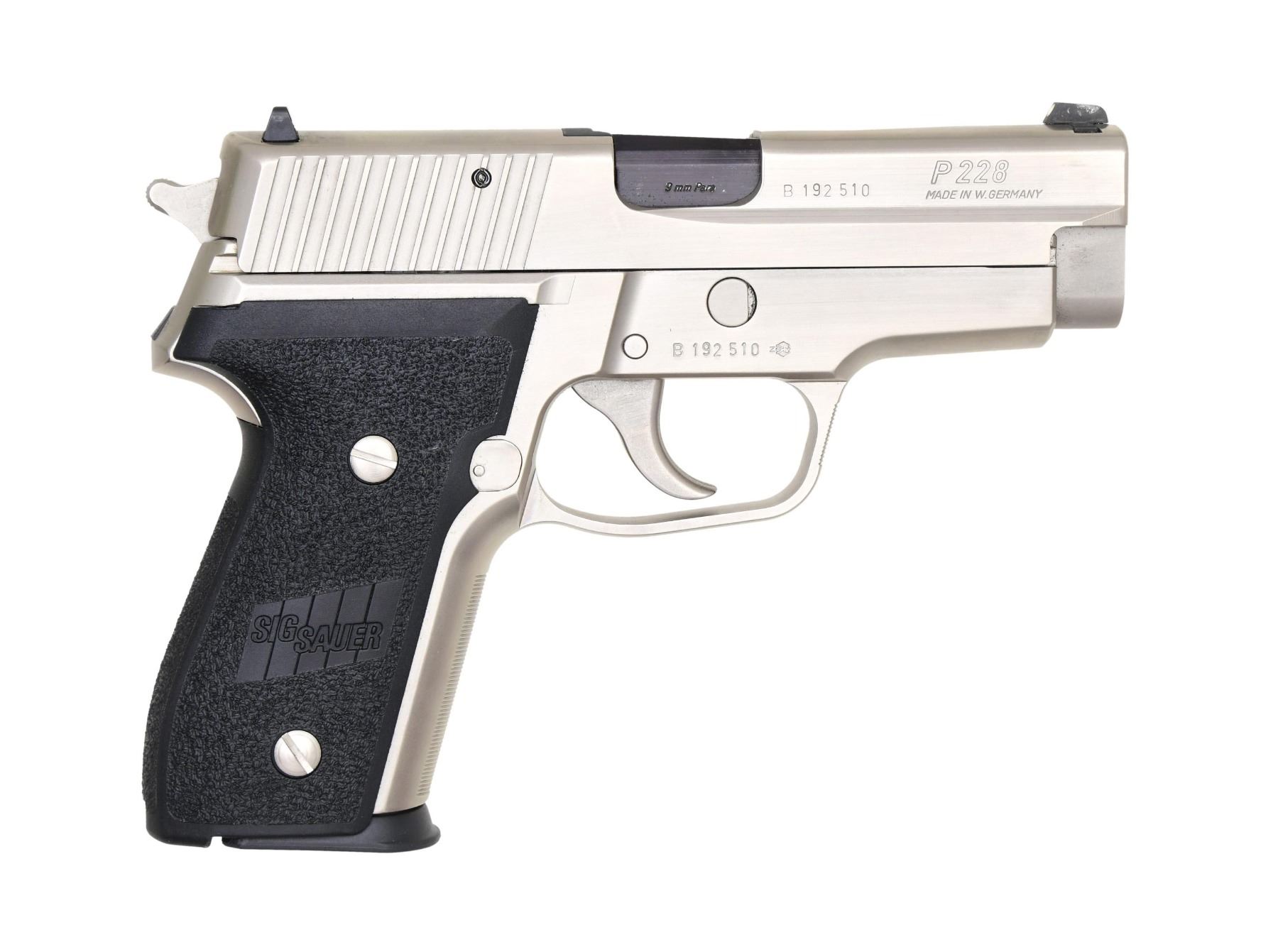 Cal. 9x19. S# B192510. Bbl. 4". White dot front sight. Square-notch rear sight with white line. West German-made P228 with Exeter, NH import marking. Bright nickel finish. Black factory grips. MAGS: two 13 rd., bright, nickel-finished. UNATTACHED ACCESSORIES: matching-numbered factory box, in fair condition, with manual and test target. CONDITION: all aspects are near excellent. PROVENANCE: from the lifelong collection of Terrence McCarty. (24-182/MJC). MODERN. $400-600.