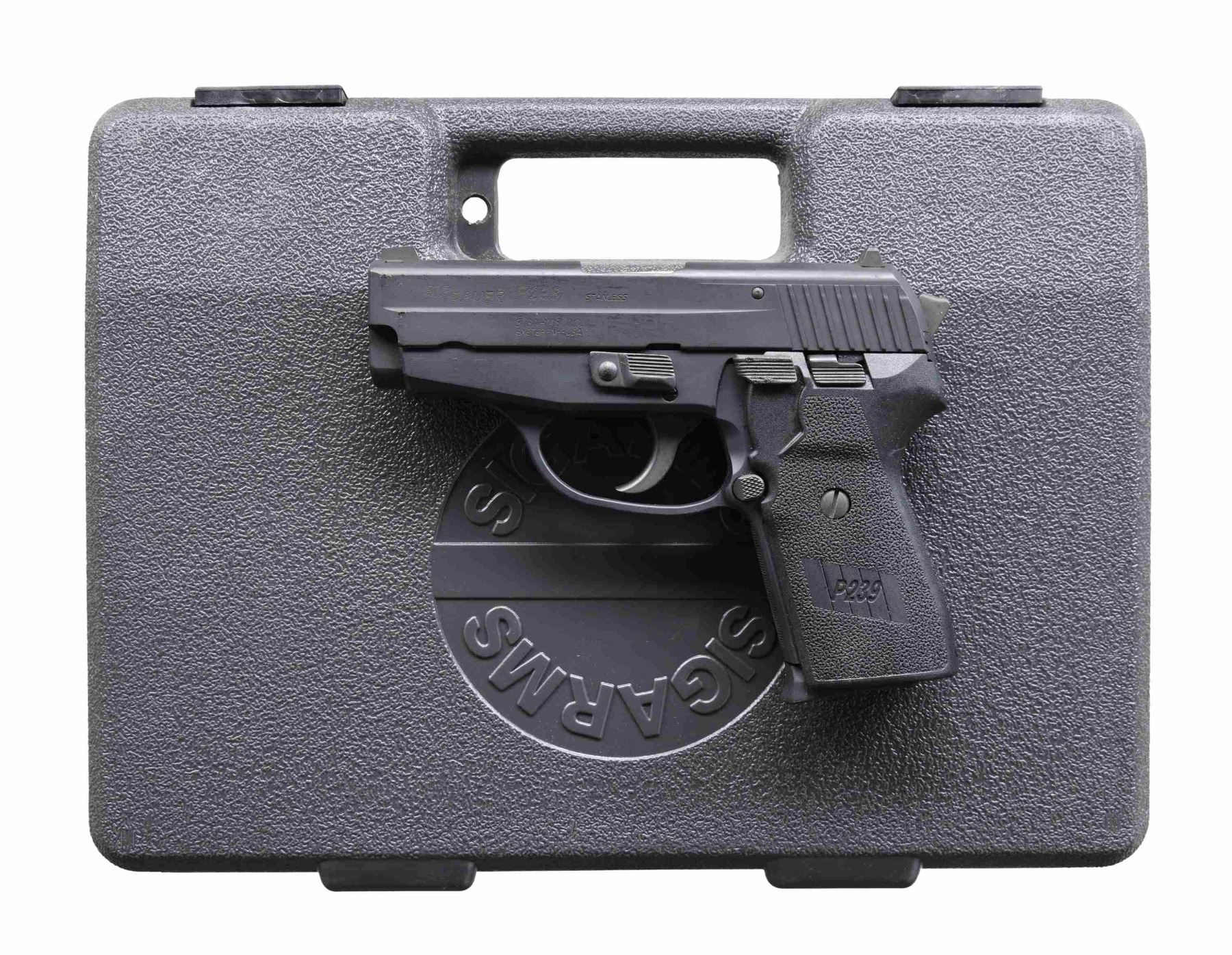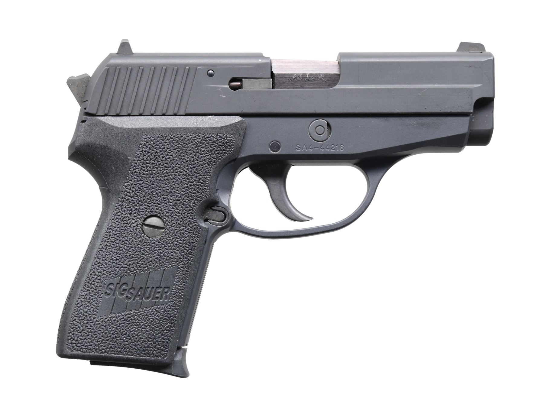 Cal. 40 S&W. S# SA4-44216. Bbl. 3 3/8". White dot front sight. Square notch rear sight with white strip. Gray Nitron finish. Pebbled black rubber grips with Sig Sauer logo. MAGS: one 7 rd. UNATTACHED ACCESSORIES: matching numbered factory box with hardcase and manual. Interior of the hardcase is falling apart and is in poor condition. CONDITION: grips and metal show scattered remnants of the case interior. Metal also shows scattered light scratches and handling marks. Action is functional but stiff likely due to buildup from the case interior. Very good+ bore. PROVENANCE: from the lifelong collection of Terrence McCarty. (24-111/MJC). MODERN. $400-600.