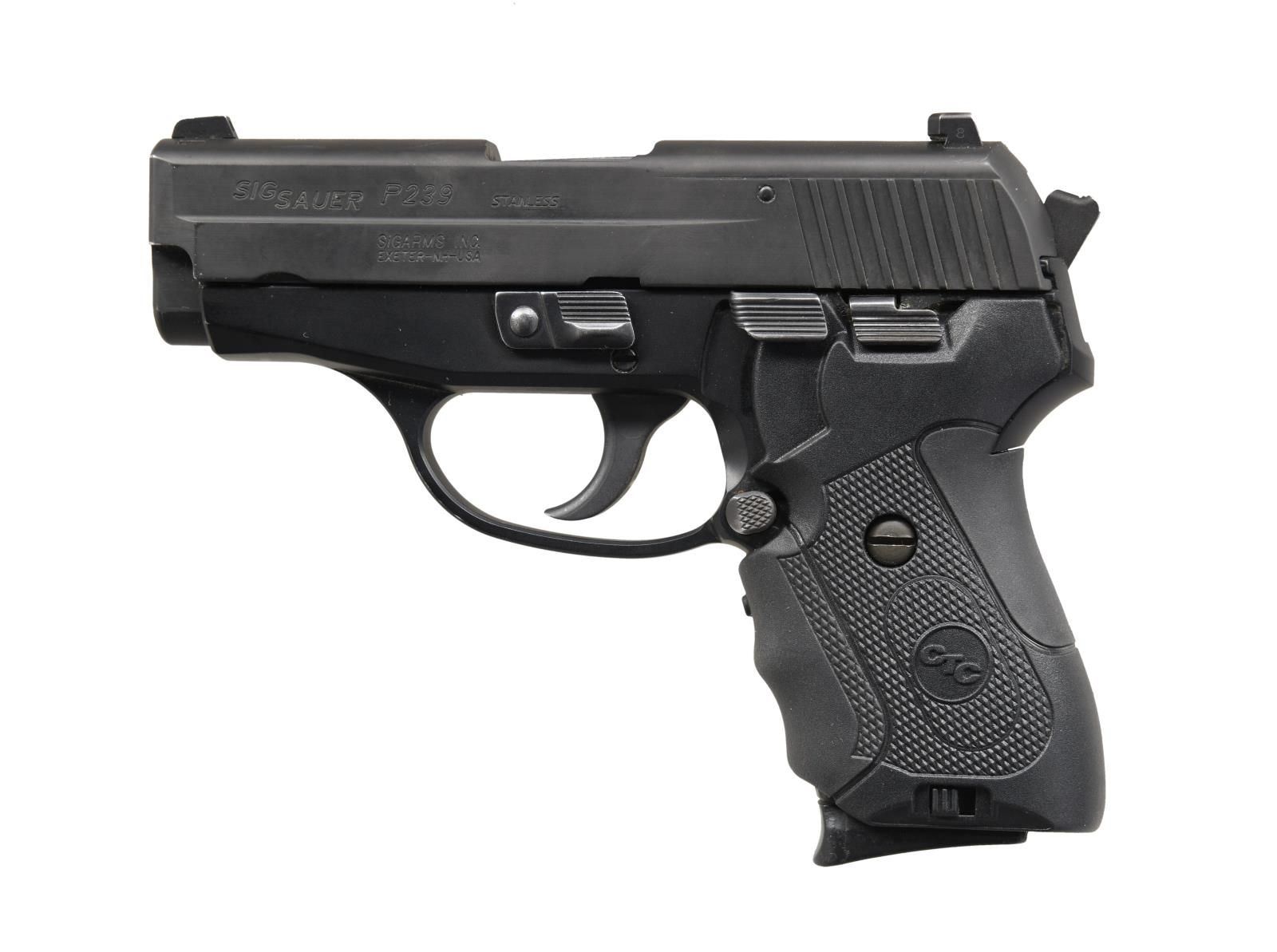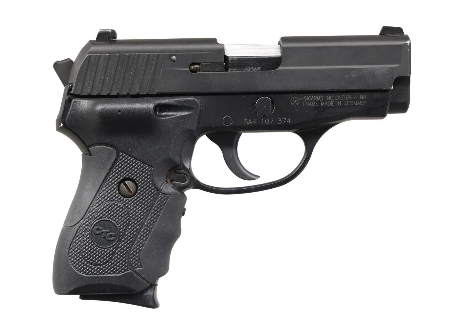 Cal. 40 S&W. S# SA4107374. Bbl. 3 1/2". Three dot sights. German-made frame with Exeter, NH import marking. Nitron finish. Crimson Trace laser grips. MAGS: two 7 rd. CONDITION: very good overall, with scattered edge, handling, and carry wear. PROVENANCE: from the collection of Gun Sport Ltd., owned by Jon R. Thomas. (23-4029/MJC). MODERN. $400-600.