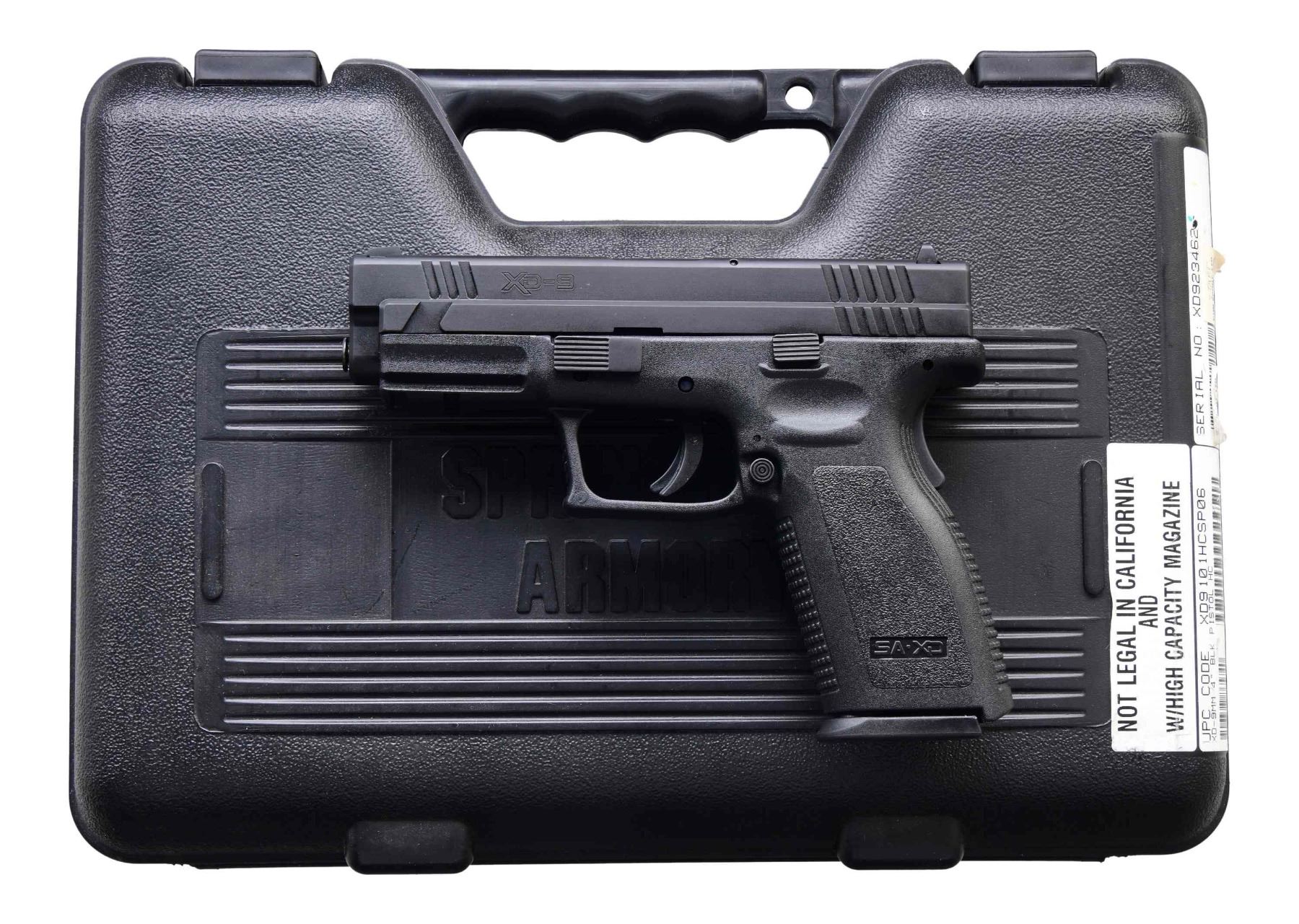 Cal. 9mm Luger. S# XD923462. Standard XD-9 model with black polymer frame and steel slide. A 4" barrel with a fixed front sight and fixed rear sight. Frame features left side thumb safety and left side magazine release. Black textured polymer grip. MAGS: two 10 Rds. UNATTACHED ACCESSORIES: factory box, holster, double magazine pouch, magazine loader, instruction manual, and promotional materials. CONDITION: an overall near excellent original finish. Bore is bright with sharp rifling. PROVENANCE: the collection of Gun Sport Ltd., owned by Jon R. Thomas. (23-3028/MD). MODERN. $300-$500.