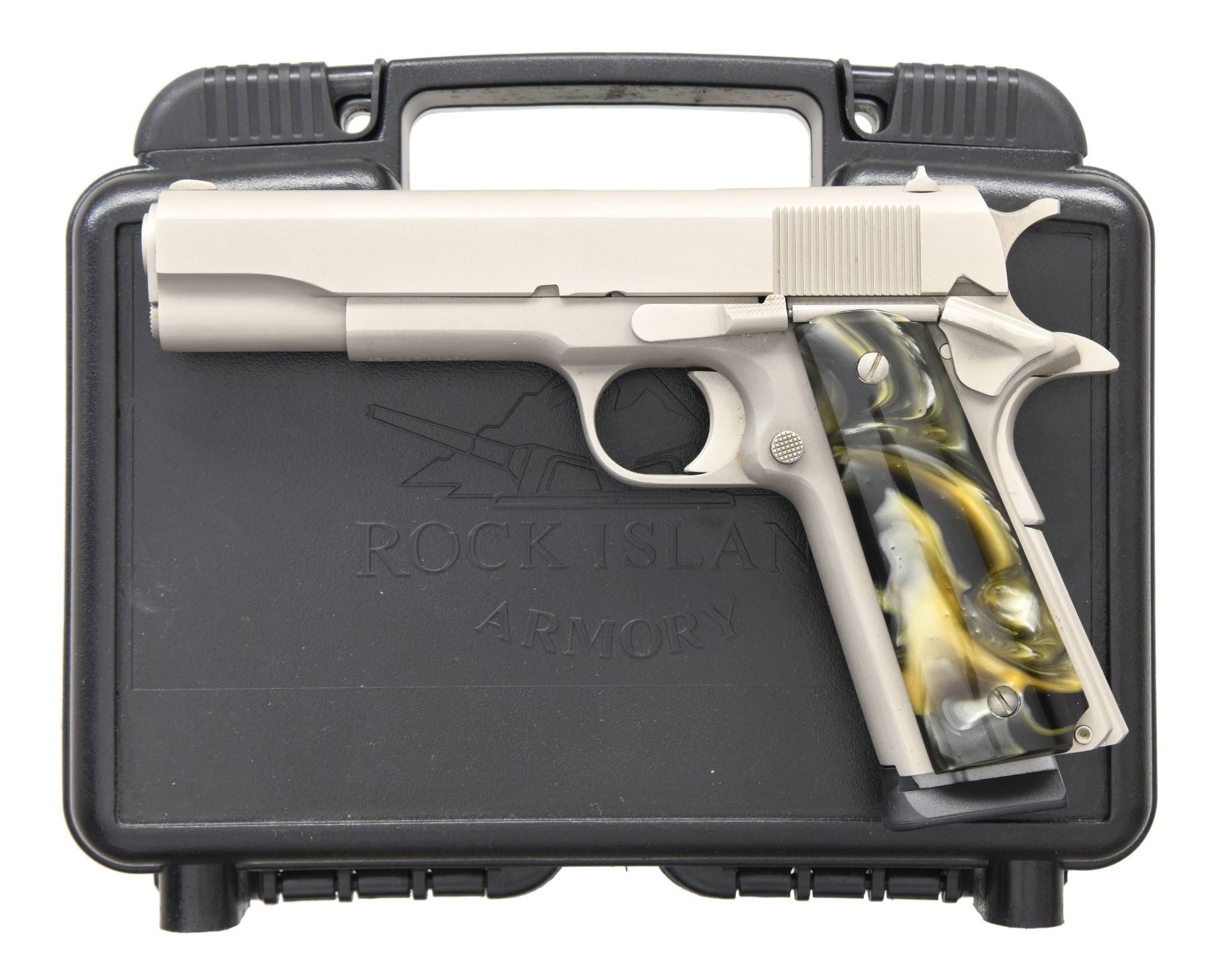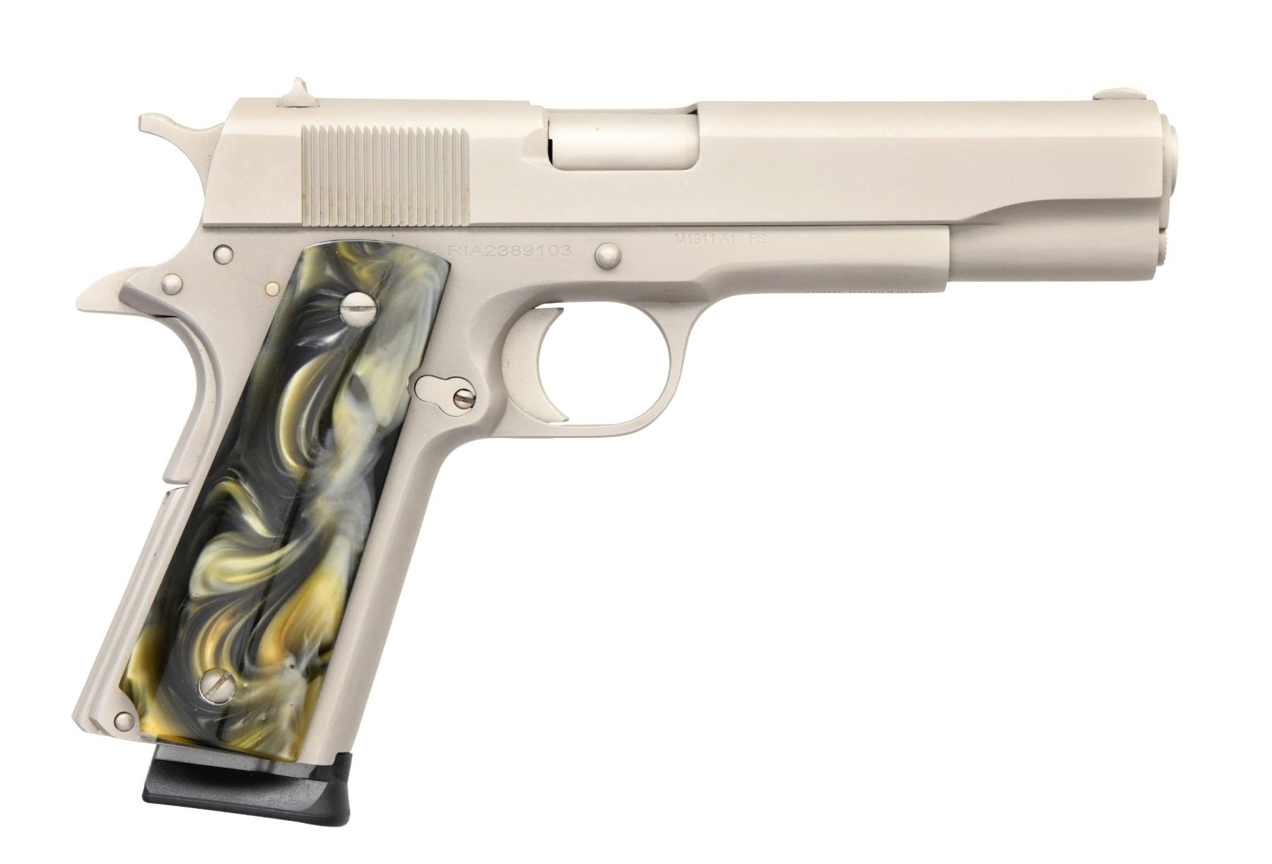 Cal. 9mm Luger. S# RIA2389103. Bbl. 5". Round blade front sight. Square notch rear sight. Frost nickel finish. Faux Mother of Pearl grips. MAGS: one 10 rd. UNATTACHED ACCESSORIES: matching-numbered factory hardcase with factory rubber grips, cable lock, and manual. CONDITION: all aspects are near excellent. PROVENANCE: from the ex-collection of Gun Sport Ltd., owned by Jon R. Thomas. (24-3787/MJC). MODERN. $700-1,000.