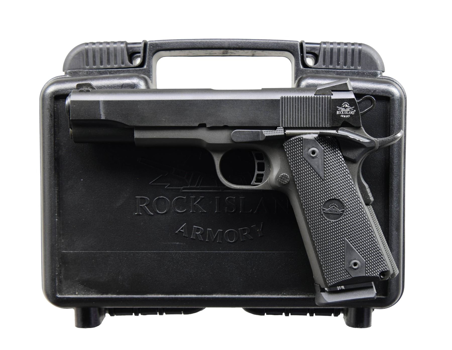 Cal. 9mm Luger. S# RIA2398868. Bbl. 5". Blade front sight. Novak style rear sight. Ambi safety. Skeletonized hammer and trigger. Parkerized finish. Checkered black rubber grips with RIA logo. MAGS: one 10 rd. UNATTACHED ACCESSORIES: matching-numbered factory hardcase with manual and cable lock. CONDITON: all aspects are near excellent. PROVENANCE: the collection of Gun Sport Ltd., owned by Jon R. Thomas. (23-4267/MJC). MODERN. $500-700.