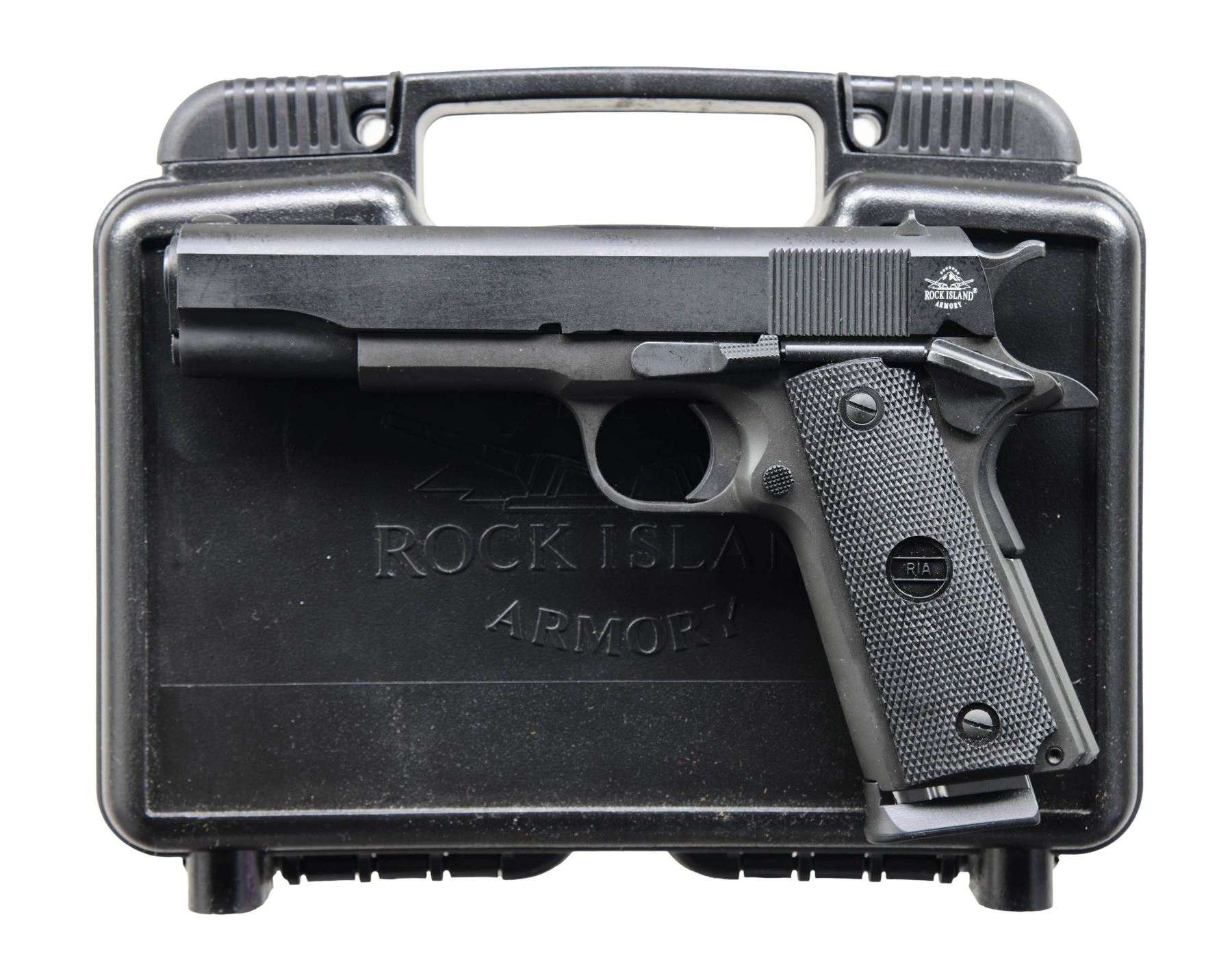 Cal. 9mm Luger. S# RIA2389101. Bbl. 5". GI-style sights. Parkerized finish. Checkered black grips with RIA logo. MAGS: one 10 rd. UNATTACHED ACCESSORIES: matching-numbered factory hardcase with manual and lock. CONDITION: all aspects are near new; in the box. PROVENANCE: from the collection of Gun Sport Ltd., owned by Jon R. Thomas. (23-4298/MJC). MODERN. $400-600.