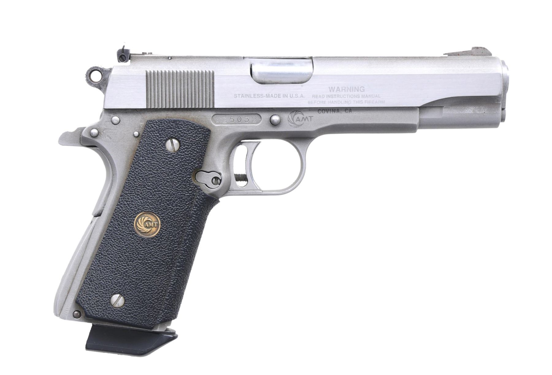 Cal. 45 ACP. S# A25032. This AMT Hardballer features a stainless steel finish with a 5-inch barrel. Fixed blade front sight and the Millett adjustable rear sight. The grips are black textured wrap-around neoprene grips with AMT medallions. MAGS: 1-7 Rds. CONDITION: Overall condition is very good with approximately 90% of the stainless finish remaining on the slide and frame. The bore is bright with sharp rifling. MODERN (24-4429/MD) $300-$450.