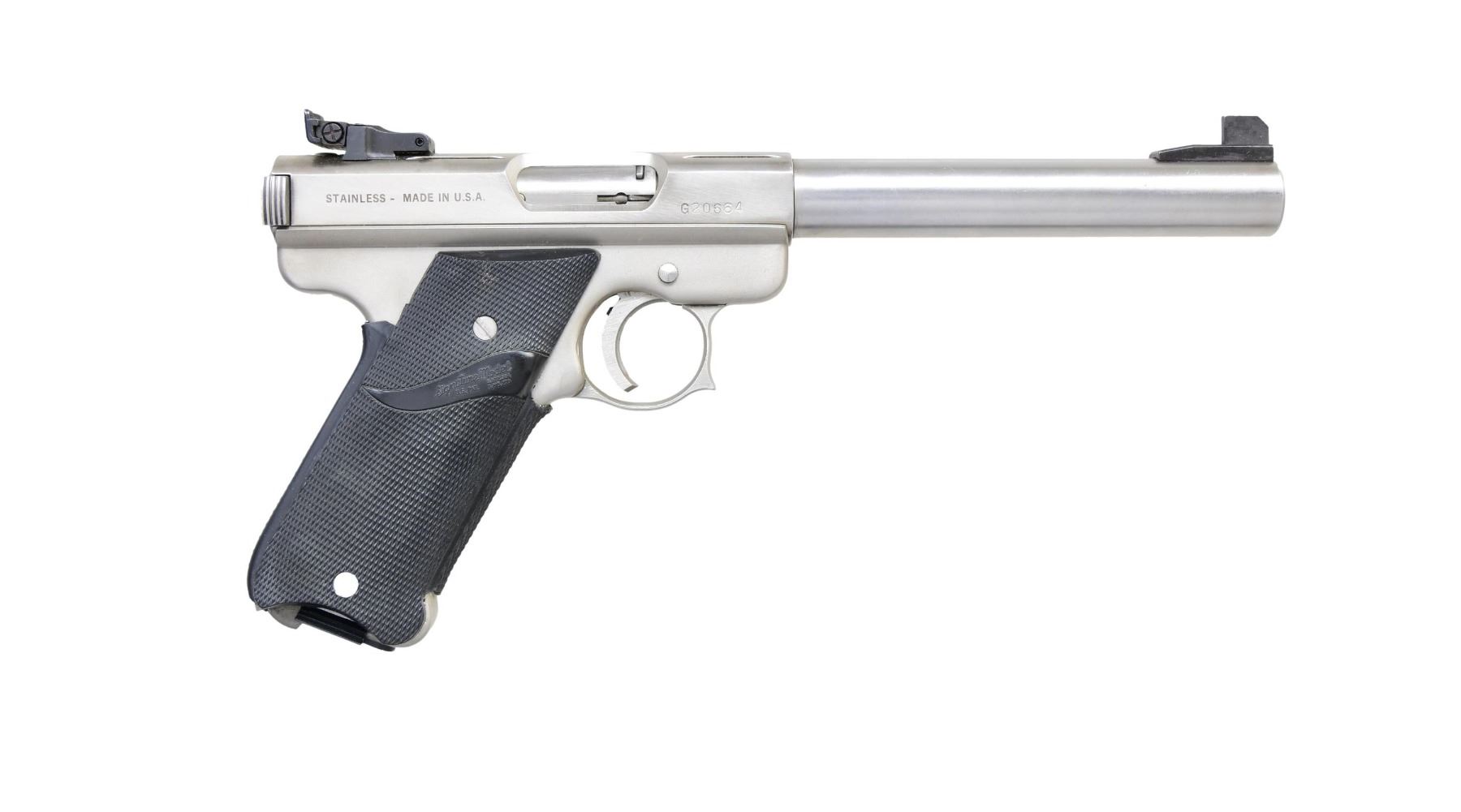 FACTORY BOX. Cal. 22 LR. S# G20664. This AMT Lightning features a stainless steel finish with a 6.5-inch bull barrel. The front sight is a fixed blade, and the rear sight is Millett adjustable notch. The grips are black checkered wrap-around Pachmayr grip. MAGS: 1-10 Rds. UNATTACHED ACCESSORIES: Factory box. CONDITION: Overall condition is near excellent with approximately 95% of the stainless finish remaining on the slide and frame. The bore is bright with sharp rifling. MODERN (24-4430/MD) $300-$400.
