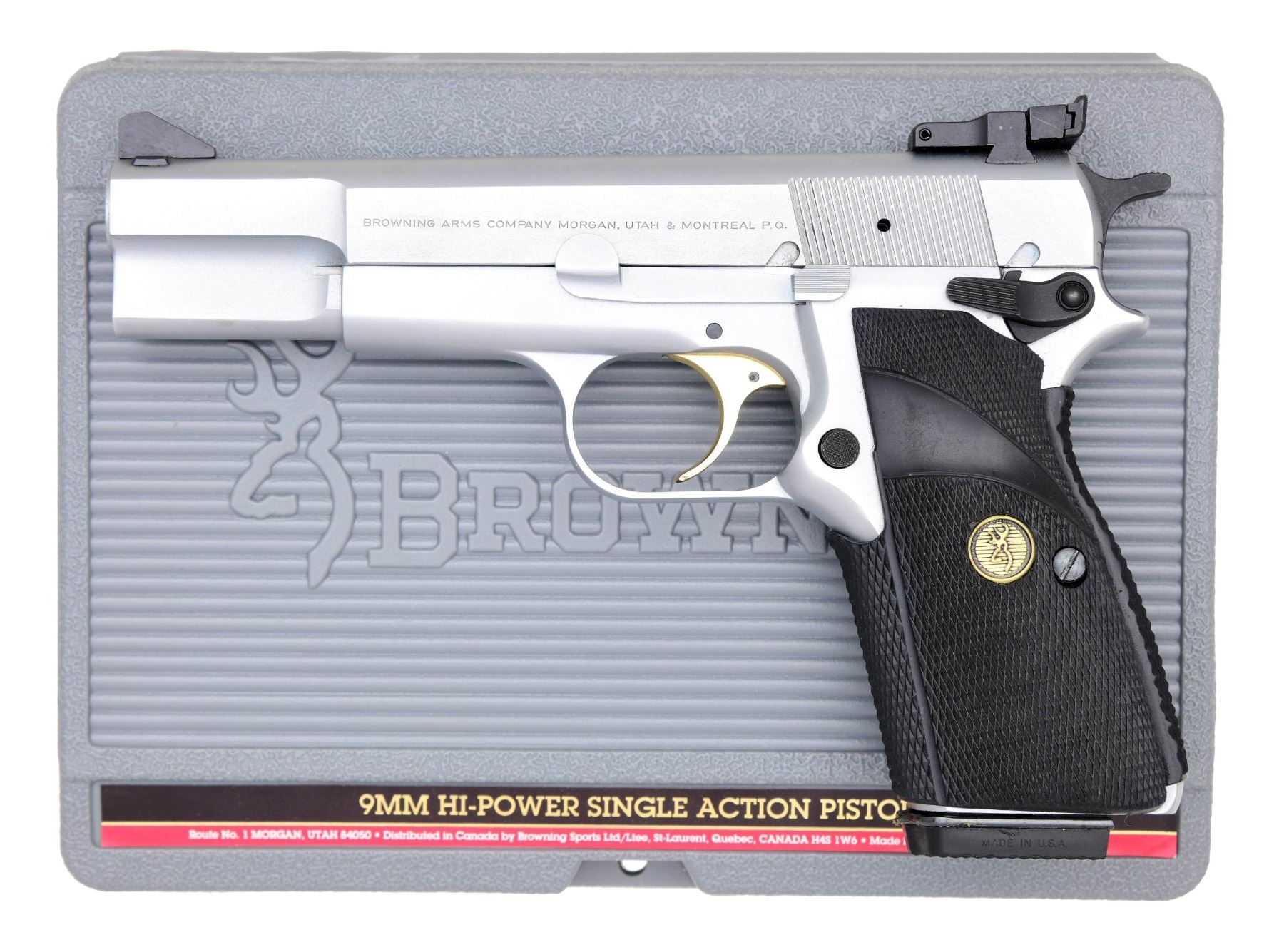 Cal. 9mm Luger. S# 245NX78548. Bbl. 4 5/8". Ramped blade front sight. Adjustable rear sight. Portuguese-assembled Browning Hi Power pistol. Silver chrome finish with gold trigger. Pachmayr Signature grips with a gold Browning logo. MAGS: two 13 rd., parkerized finish. UNATTACHED ACCESSORIES: matching numbered factory hardcase and manual. CONDITION: all aspects are near excellent. (23-7154/MJC). MODERN. $700-1,000.