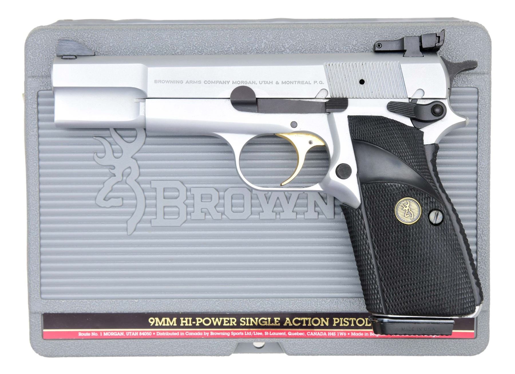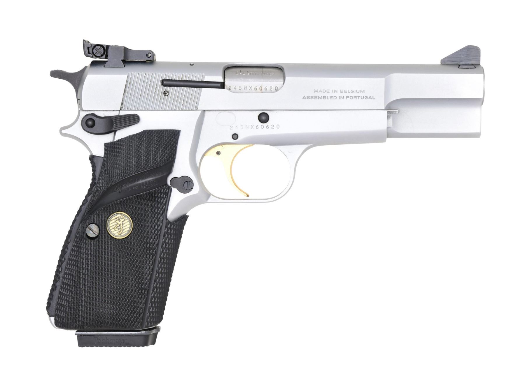 Cal. 9mm Luger. S# 245NX60620. Bbl. 4 5/8". Ramped blade front sight. Adjustable rear sight. Portuguese assembled Hi Power pistol. Silver chrome finish with gold trigger. Ambi safety. Pachmayr Signature grips with a gold Browning logo. MAGS: two 13 rd. with parkerized finish. UNATTACHED ACCESSORIES: correct factory hardcase, which is missing the part of the label where the serial number is, and a manual. CONDITION: all aspects are near excellent. (23-7155/MJC). MODERN. $700-1,000.