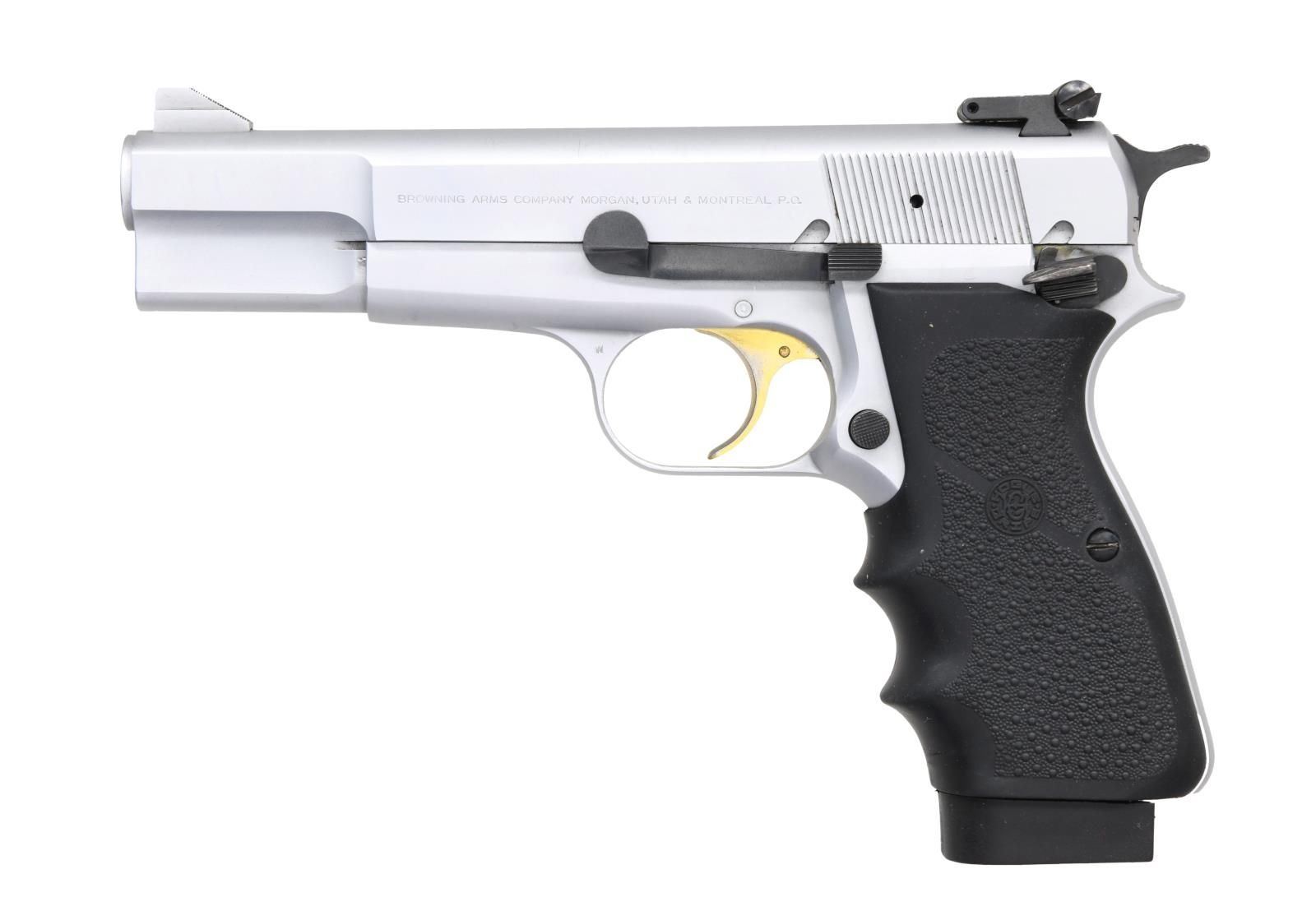 Cal. 9mm Luger. S# 245PY43133. Bbl. 4 5/8". Ramped blade front sight. Adjustable rear sight. Mfg. 1982 in Belgium. Satin nickel finish w/ gold trigger, blued rear sight, hammer, mag release, & extended safety. Hogue finger groove grips. MAGS: 1-17 rd. & 1-13 rd. both marked "KRD" on baseplate. UNATTACHED ACCESSORIES: black leather Browning soft case. CONDITION: grips show light handling marks. Metal shows some light scratches & handling marks. Very good, bright bore. (23-7194/MJC). MODERN. $600-900.
