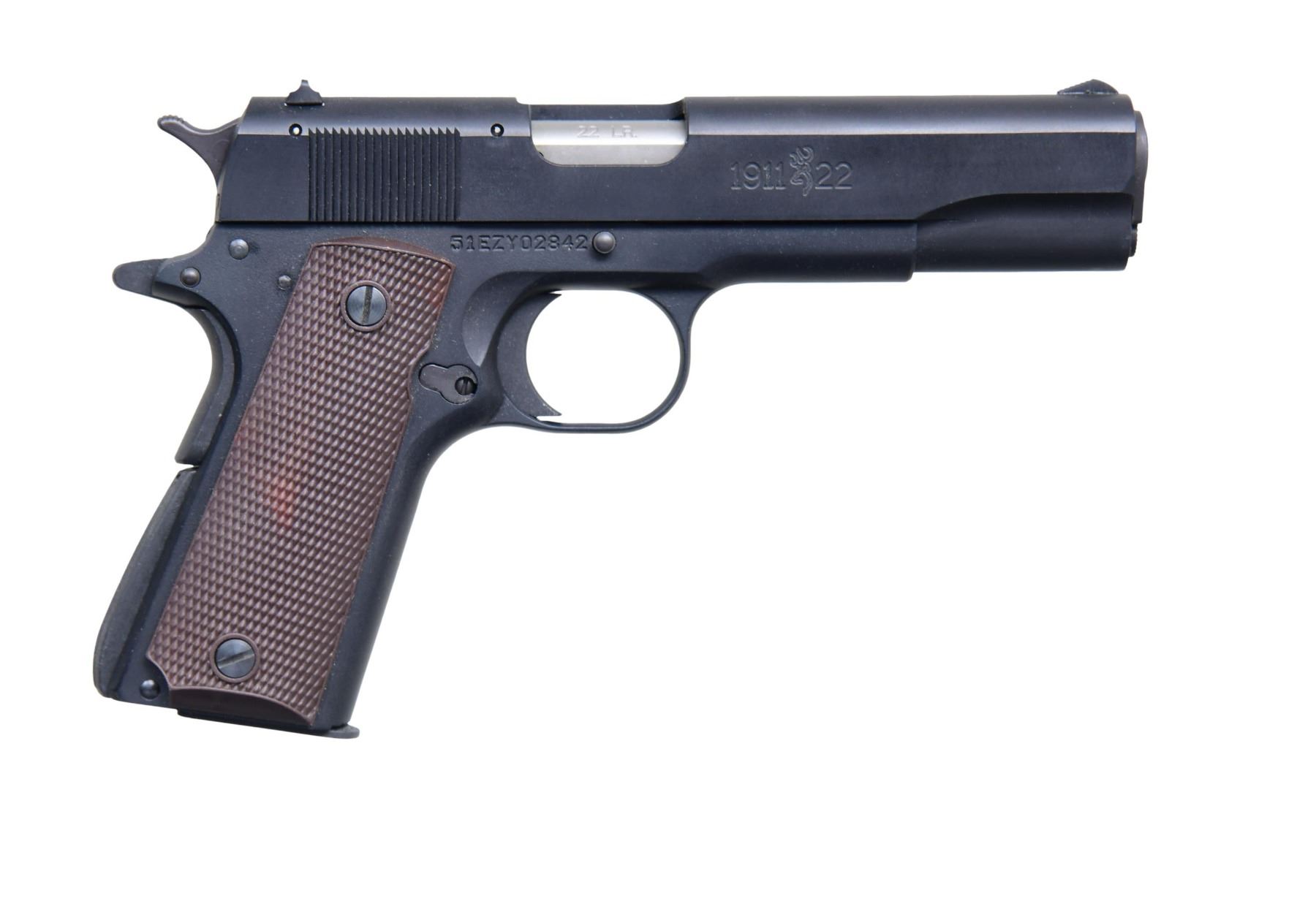 Cal. 22 LR. S# 51EZY02842 (2012). This example features a matte black finish with a 4.25-inch barrel and fixed sights. The left side of the slide is marked "BROWNING ARMS CO. MORGAN, UT. U.S.A." while the right side is marked "1911-22." The frame is of a standard 1911 configuration with a thumb safety on the left side. The grips are checkered brown plastic. MAGS: 1-10 Rds. CONDITION: near excellent overall, with approximately 98% of the original finish remaining, showing minimal wear. The bore is bright with sharp rifling. MODERN. (24-4457/MD) $250-350