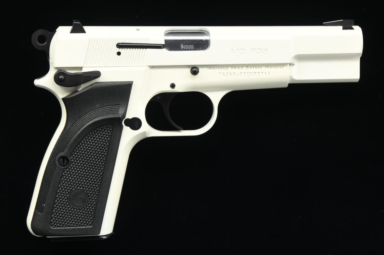 Cal. 9mm Luger. S# T6368-22EU02744. Bbl. 4 5/8". Blade front and fixed notch rear sights with white outline. White finish. Ambi safety. Checkered black grips with thumb grooves. MAGS: one 15 rd. Mec Gar. UNATTACHED ACCESSORIES: matching numbered factory hardcase with cable lock, bore brush, cleaning rod, and manual. CONDITION: slide and frame show a few spots of flaking and some light staining. Other aspects rate very good plus or better. PROVENANCE: from the collection of Gun Sport Ltd., owned by Jon R. Thomas. (23-4630/MJC). MODERN. $300-500.