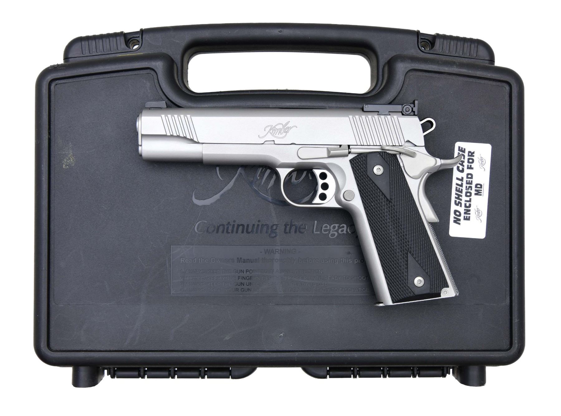 WITH MATCHING FACTORY CASE. Cal. 9x19mm. S# KF24309. Bbl. 5". Stainless Target II semi-automatic pistol mfg. by Kimber. Left side of the slide is marked with the Kimber trademark logo, with the model designation marked on the right. Right side of the frame is marked with Kimber's mfg. information and the S#. Metal components exhibit a satin stainless steel finish. Frame is mounted with 2-piece checkered black rubber grips. Blade front sight with adj. square notch rear sight. MAGS: one 9-rd. UNATTACHED ACCESSORIES: matching factory case. CONDITION: near new, with metal components retaining virtually all of their original factory finishes overall. Mirror bore, exhibiting well-defined rifling throughout. Grips are excellent overall. Case is good. (24-3462/MLW). MODERN. $700-1,000.