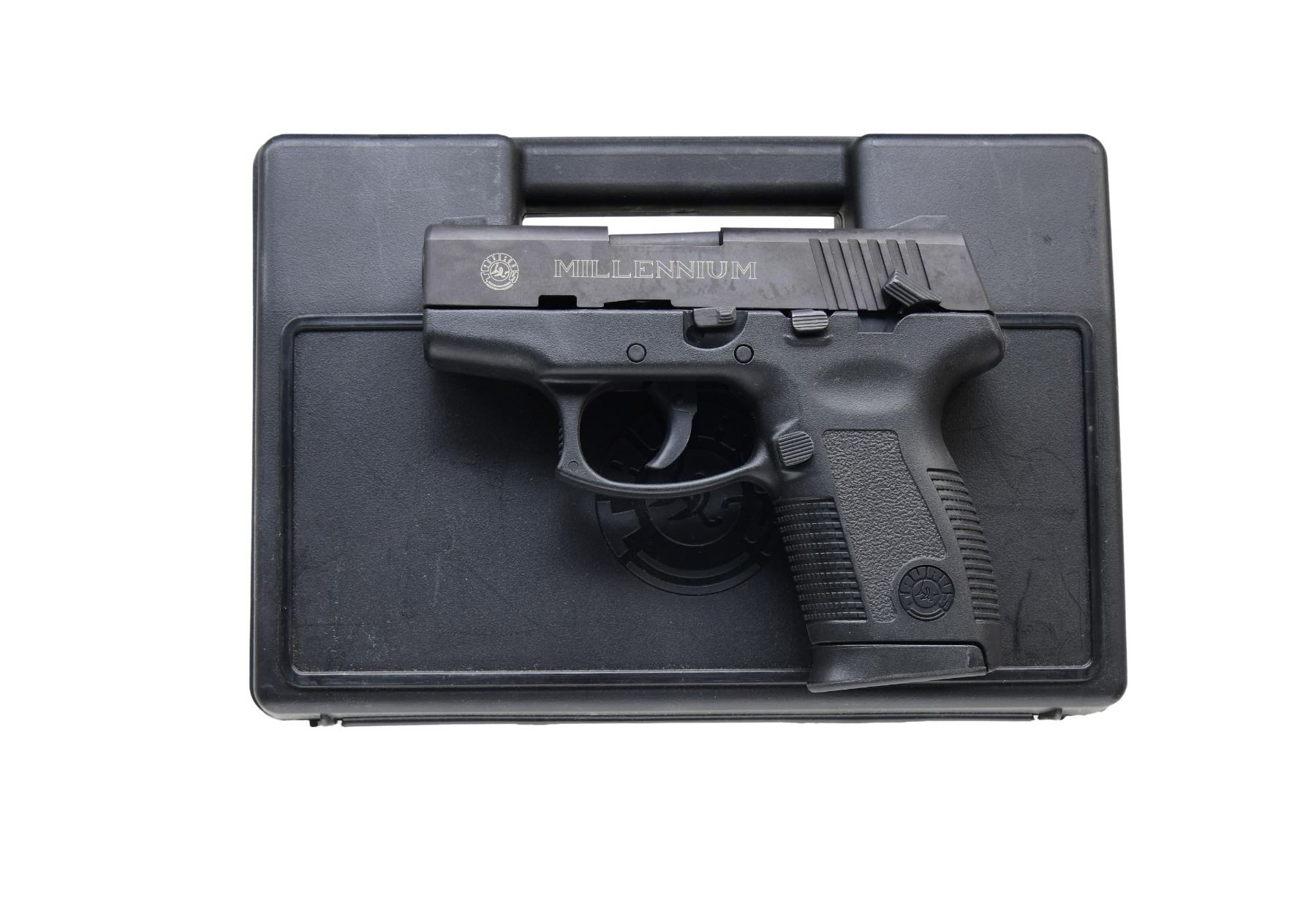 Cal. 45 ACP S# NUH79512. The Taurus PT 145 Millennium is a semi-auto pistol with a polymer frame and matte black finish. It features a 3.25" barrel with fixed 3-dot sights. The frame has an integrated slide release and magazine release on the left side. The grips are textured polymer. MAGS: one 10 Rds. UNATTACHED ACCESSORIES: factory box, manual, magazine loader, safety keys, and cleaning brush. CONDITION: overall near excellent with approximately 95% of the original finish remaining on the slide and frame. Bore is bright with strong rifling. PROVENANCE: from the lifelong collection of Terrence McCarty. (24-55/MD). MODERN. $400-$600.