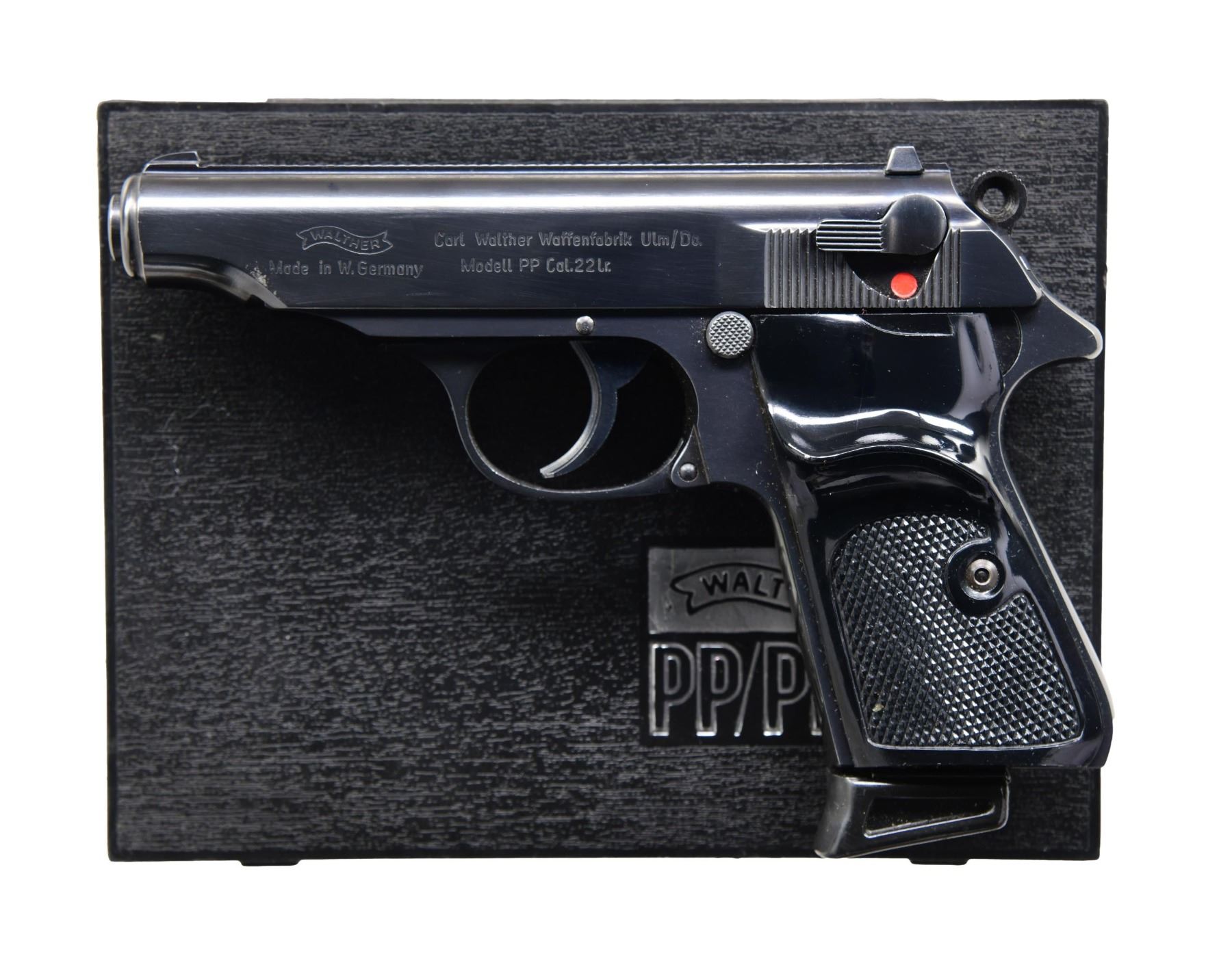 PISTOL WITH MATCHING FACTORY CASE & PAPER TEST TARGET. Cal. 22 LR. S# 50126LR. Bbl. 3 7/8". Model PP semi-automatic pistol mfg. in West Germany by Walther in 1981. Left side of the slide is marked with the Walther banner logo above "Made in W. Germany," followed by markings stipulating Walther's mfg. information as well as the model and cal. designations. Right side of the frame is marked with an Eagle/N commercial nitro proof, followed by an "IB" (81) date code, and an Ulm Proof House antler. Metal components exhibit a blue finish overall, save for the chamber, which is polished in-the-white. Frame is mounted with 2-piece checkered black plastic thumbrest grips. Matching numbers are present on the frame and slide. MAGS: two 10-rd. mags., 1 with black plastic grip extension. UNATTACHED ACCESSORIES: matching factory black plastic hard case, containing a manual, as well as a matching factory paper test target. CONDITION: metal components retain bountiful amounts of their original factory blue finish, exhibiting some superficial marks from handling and storage overall. Mirror bore, exhibiting well-defined rifling throughout. Grips show some superficial marks from handling and storage. Case shows some warping, as well as some marks from handling and storage, but otherwise remains sturdy and serviceable. (24-3879/MLW). MODERN. $500-800.