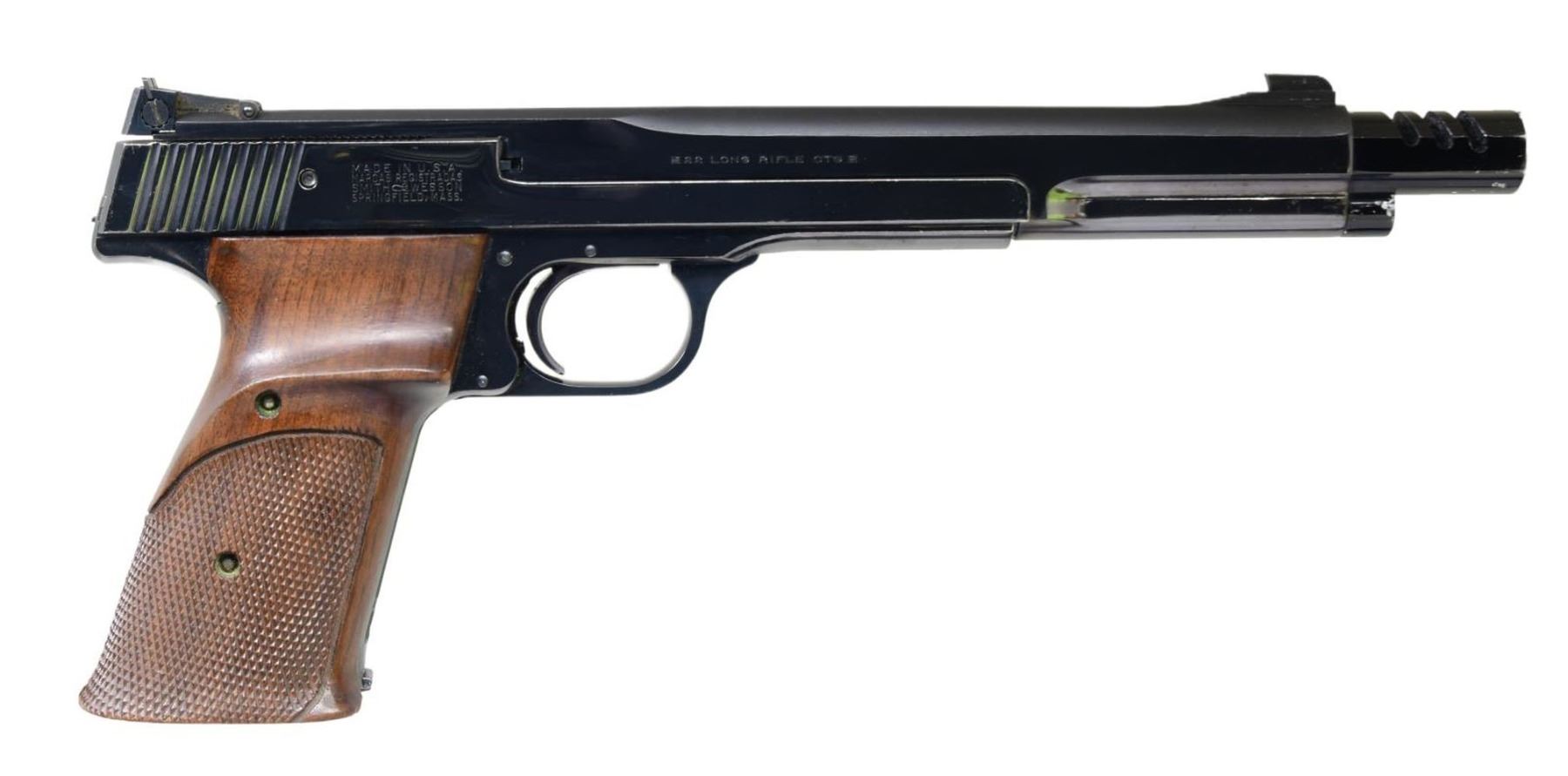 Cal. 22 LR. S# 3113. Bbl. 7" with added compensator. Blue finish. Patridge front sight and adjustable target rear sight. Checkered walnut target grips with thumb rests. MAGS: one 10 Rds. CONDITION: very good reblue finish with numerous marks and scratches. Very good grips. The bore is bright with strong rifling. (24-4942/MD). CURIO. $700-1,000.