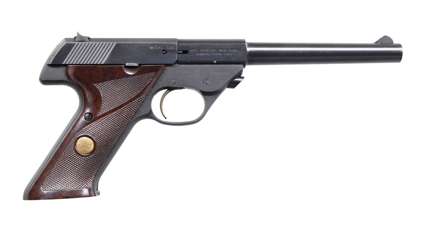 This lot consists of the following High Standard Pistols both Cal. 22 LR: 1) HIGH STANDARD SPORT KING 102 SEMI AUTO PISTOL. S# 1020980. Bbl. 6 1/2". Blade front sight. Square-notch rear sight. Mfg. 1958-1960. Blued finish slide and bbl. Frame has a dull gray finish. Gold trigger. Checkered brown grips with gold High Standard medallions. MAGS: one 10 rd. CONDITION: grips show light handling wear. Metal retains 90% of its finishes, with some light oxidation and scattered edge & handling wear. Action functions properly when hand-cycled. Very good bore. (24-3864/MJC). 2) HIGH STANDARD MODEL B SEMI AUTO PISTOL. S# 21585. Bbl. 6 1/2". Blade front sight. Square-notch rear sight. Blued finish. Checkered black grips. MAGS: one 10 rd. CONDITION: grips show some light handling wear. Metal retains 40% blue with overall fading to brown and some scattered light oxidation. Action functions properly when hand-cycled. Very good bore. (24-3869/MJC). BOTH CURIO. $450-850 for pair.