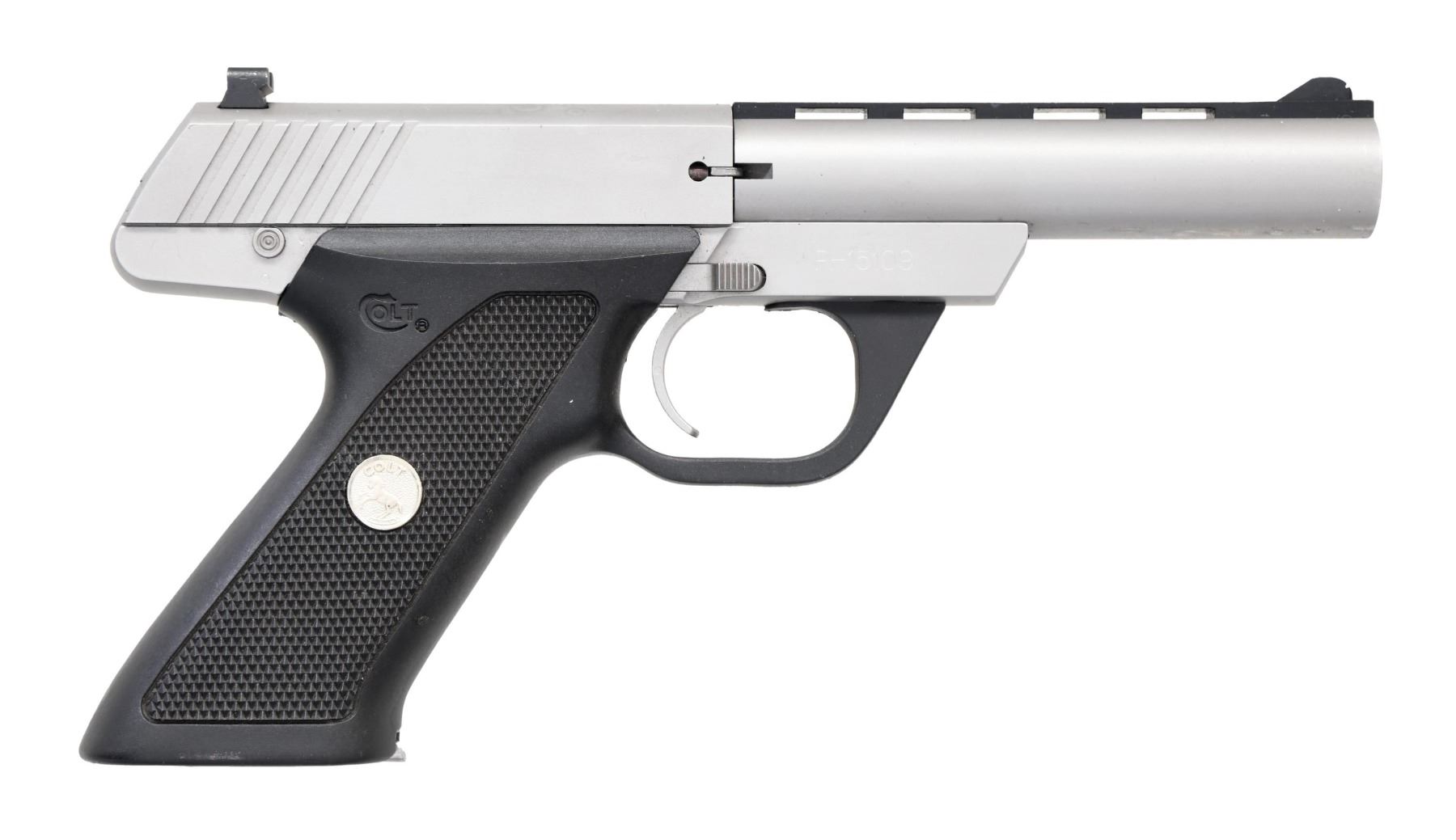 Cal. 22 LR. S# PH15109. Bbl. 4 1/2" with VR. Blade front sight. Square-notch rear sight. Stainless finish. Checkered black grip frame with silver Rampant Colt Medallions. MAGS: two 10 rd. UNATTACHED ACCESSORIES: unnumbered factory hardcase with manual. CONDITION: all aspects rate very good+ or better, with some light edge and handling wear. (24-3790/MJC). MODERN. $300-450.