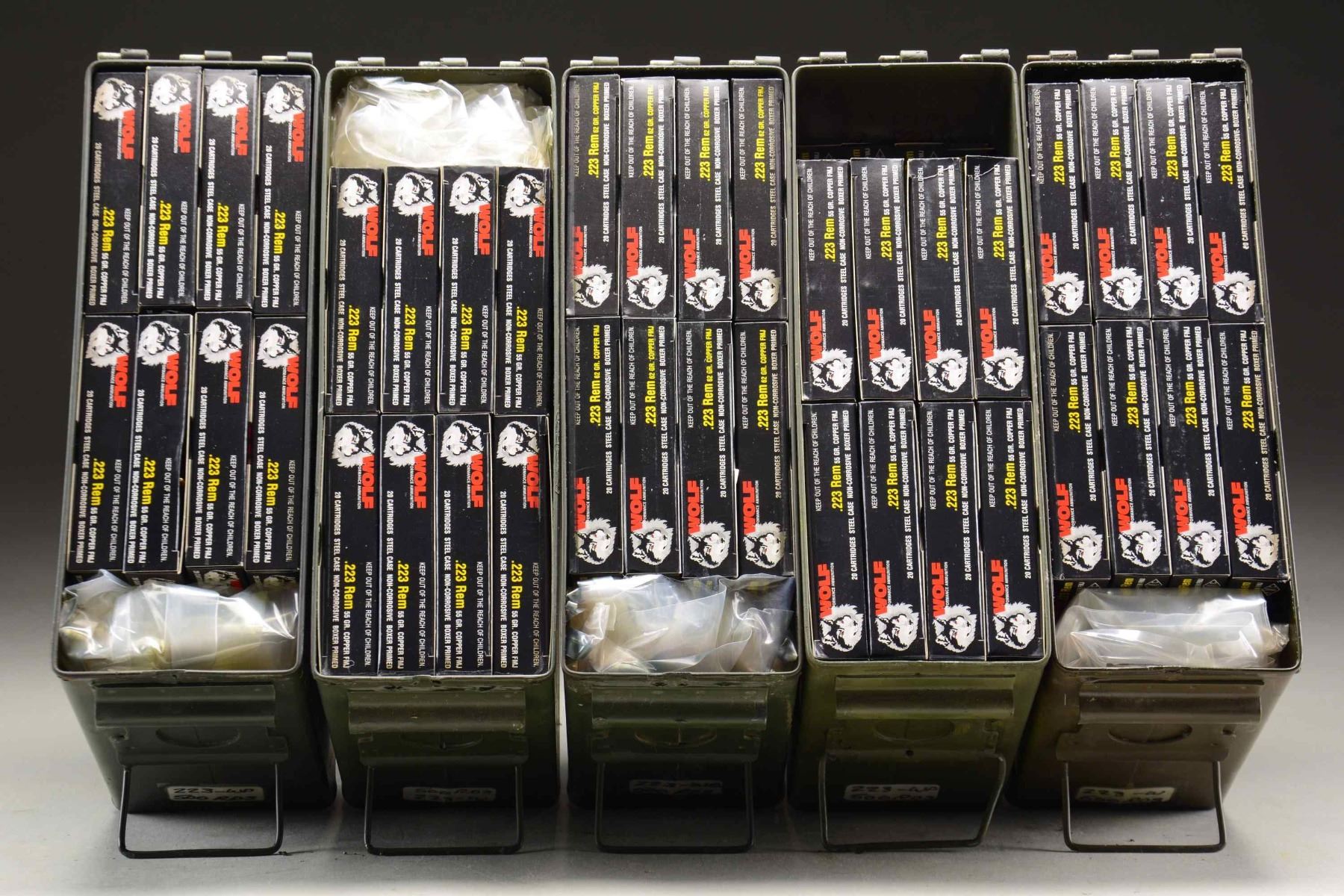This lot consists of about 2500 rds. of Wolf 223 Rem. 55 gr. copper FMJ ammo. Ammo is steel cased & is in its factory boxes & is further housed in five USGI 30 Cal. ammo cans. CONDITION: very good plus to excellent overall. (02-23229-12/MJC). $500-800 for lot.