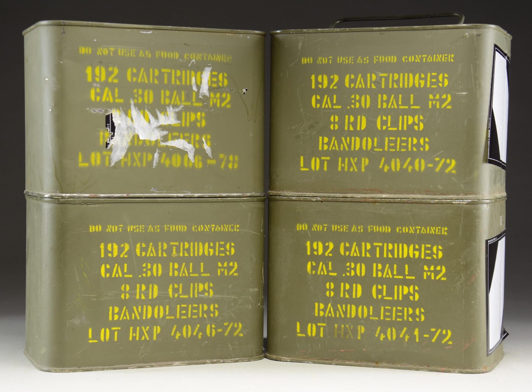 OF CAL. 30 BALL M2 AMMO ON ORIGINAL EN-BLOC CLIPS IN BANDOLEERS. A total of 768 rds of Caliber 30, BALL M2 on En-Bloc Clips & in original bandoleers. Lot consists of 4 sealed cans containing 192 rds. each & includes the "tuna key" to open them. CONDITION: Each can is clean, wearing its original OD Green paint, w/ clear yellow stenciled military markings. (02-23229-5/JZ). $300-450.