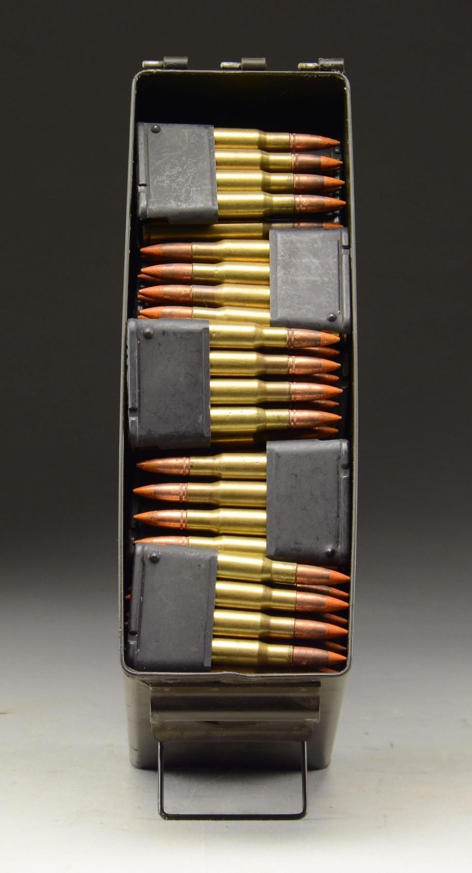 CLIPS FOR M1 GARAND RIFLE. 280 rds.of 30-06 Tracer ammunition, loaded in 35 En-Bloc Garand, 8 rd. clips. Orange tip. Various headstamps. Packaged in green, U.S. Military 30 Caliber ammo can originally stenciled for Cal. 30 M2 ammo. CONDITION: Cases remain quite bright and orange tips retain heavy coverage. (02-23229-41/JZ). $200-400.
