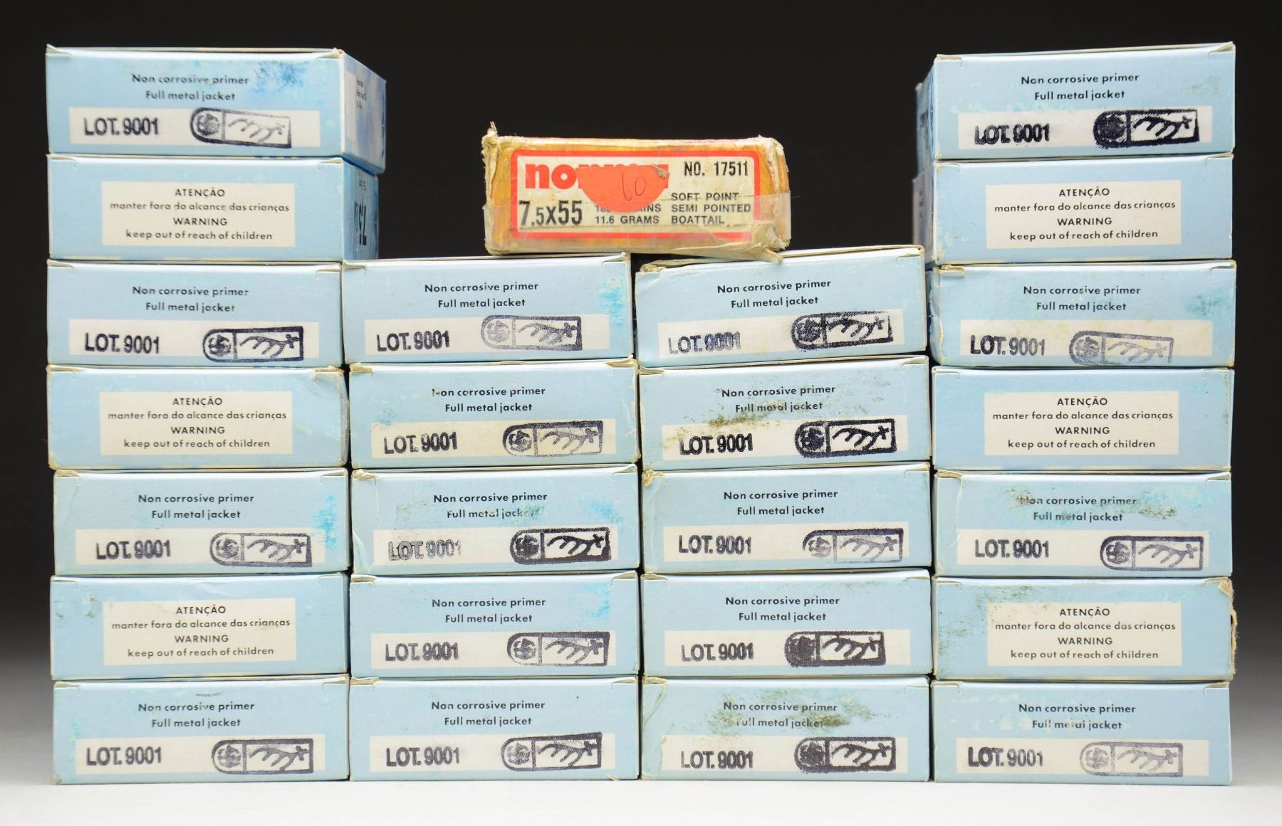This lot consists of the following commercial 7.5x55 Swiss ammo: 1) One 20 rd. box of Norma 180 gr. soft point ammo. 2) Twenty four 20 rd. boxes of FNM 170 gr. FMJ ammo. CONDITION: boxes show varying degrees of wear & staining. Ammo appears very good overall. (02-23173/MJC). $300-500.