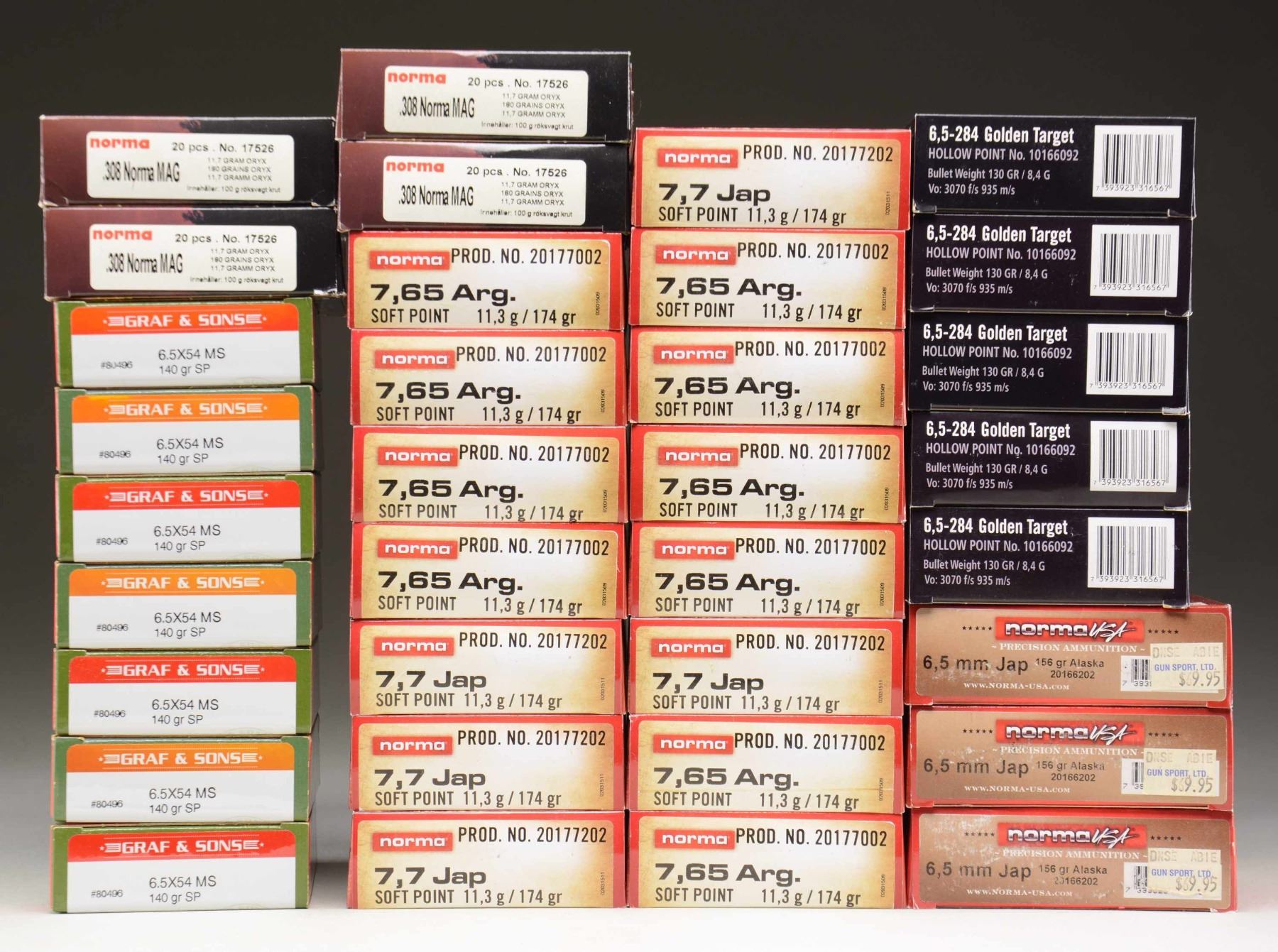CALIBERS. Lot contains Hollow Points. 7.65 ARGENTINE: 15 - 20 Rd. boxes NORMA 174 Gr. Soft Point. / 6.5X54 MANNLICHER SHOENAUER: 7 - 20 Rd. boxes GRAF & SONS (HORNADY) 140 Gr. Soft Points. / 6.5 JAPANESE: 3 - 20 Rd. boxes NORMA 156 Gr. Alaska. 6.5-284: 5 - 20 Rd. boxes NORMA GOLDEN TARGET 130 Gr. Hollow Points. / .308 NORMA MAG.: 4 - 20 Rd. boxes NORMA ORYX 180 Gr. ORYX. CONDITION: ammunition appears clean and serviceable. Boxes have only very light wear. PROVENANCE: from The Collection of Gun Sport Ltd owned by Jon R. Thomas. (02-20565/ RW). NONGUN. $1,000-1,800.
