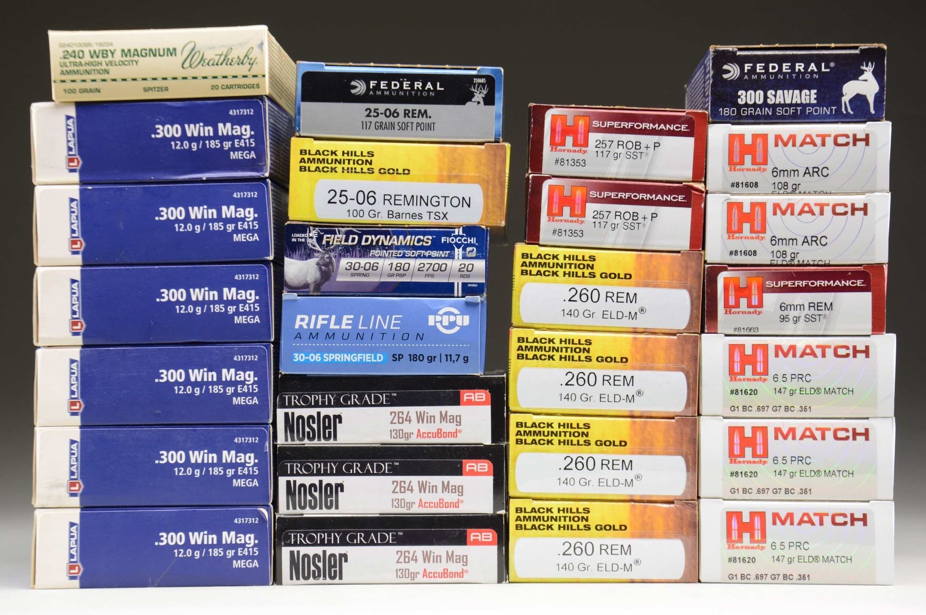 AMMUNITION. 240 WEATHERBY MAG.: 1 - 20 Rd. box 100 Gr. Spitzer. / 6MM REMINGTON: 1 - 20 Rd. box HORNADY 95 Gr. SST bullets. / 257ROBERTS +P: 2 - Boxes of 20 HORNADY 117 Gr. SST bullets. / 25-06 REMINGTON: 1 - Box of 20 BLACK HILLS 100 Gr. BARNES TSX bullets. / 1- Box of 20 FEDERAL 117 Gr. Soft Point. / 6MM ARC: 2 - Boxes of 20 HORNADY MATCH 108 Gr. XLD MATCH bullets. / 6.5 PRC: 3 - Boxes of 20 HORNADY MATCH 147 Gr. ELD MATCH. / 260 REMINGTON: 4 - Boxes of 20 BLACK HILLS GOLD 140 Gr. ELD-M bullets. / 264 WINCHESTER MAG. 3 - Boxes of 20 NOSLER TROPHY GRADE 130 Gr. ACCUBOND bullets. / 300 SAVAGE: 1 - Box of 20 FEDERAL 180 Gr. Soft Point bullets. / 30-06 SPRINGFIELD: 1 - Box of 20 PPU RIFLELINE 180 Gr. Soft Points. / 1 - Box of 20 FIOCCHI FIELD DYNAMICS 180 Gr. Pointed Soft Points. / 300 WINCHESTER MAG: 6 - Boxes of 10 LAPUA 185 Gr. MEGA bullets. CONDITION: ammo appears clean and serviceable. Boxes have moderate handling wear. PROVENANCE: from The Collection of Gun Sport Ltd owned by Jon R. Thomas. (02-20603/RW). NONGUN. $1,000-1,500.