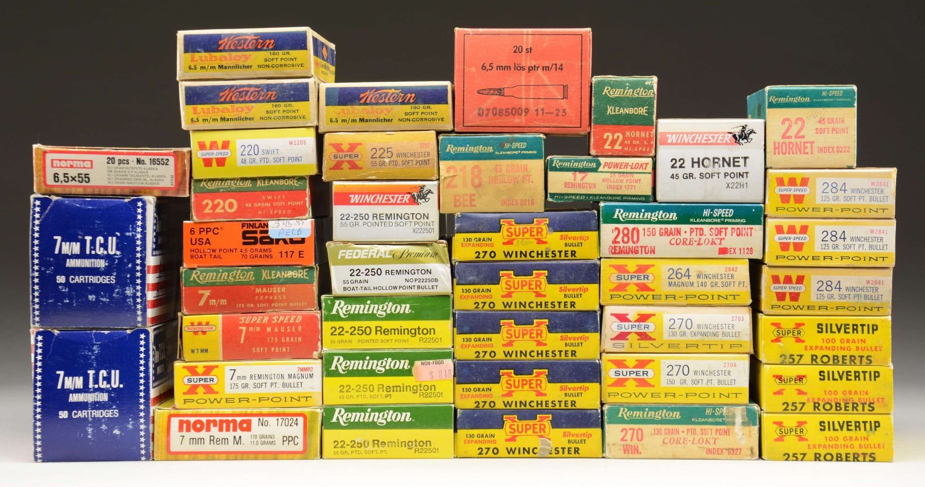 AMMUNITION. Lot contains hollow points. Full and part boxes. 22 HORNET: 2 boxes of 50 REMINGTON HI-SPEED 45 Gr. soft points. / 1 box of 50, 38 remaining WINCHESTER SUPER-X 45 Gr. SP. / 17 REM: 1 box of 20 REMINGTON POWER-LOKT 25 Gr. hollow points. / 218 BEE: 1 box of 50 REMINGTON 48 Gr. Hollow point. / 220 SWIFT: 1 box of 20 WINCHESTER SUPER SPEED 48 GR. PTD. SP. / 1 part box of 20 6 remaining REMINGTON Hi-Speed. 48 Gr. SP. / 225 WIN: 1 box of 20 WINCHESTER SUPER SPEED 55 Gr. PTD. soft point bullets. / 22-250: 2 boxes of 20 REMINGTON HIGH VELOCITY 55 Gr. PSP. / 1 box of 20 REMINGTON part box 13 remaining. / 1 box of 20 WINCHESTER 55 Gr. PSP. / 1 box of 20 FEDERAL PREMIUM 55Gr. Boat-tail hollow points. / 6PPC: 1 box of 20 SAKO USA 70 Gr. Hollow point boat tail. / 257 ROBERTS: 3 boxes of 20 WESTERN SUPER -X 100 Gr. silver tip bullets. / 6.5 MM MANNLICHER: 3 boxes of 20 WESTERN Lubaloy 160 Gr. soft point bullets. / 6.5X55: 1 box of 20 NORMA 156 Gr. SP ALASKA. / 1 box of 20 SWEDISH military wooden bullet blanks. / 264 WIN MAG: 1 box of 20 WESTERN SUPER-X 140 Gr. Soft points. / 270 WIN: 5 boxes of 20 WESTERN SUPER-X 130 Gr. Silver tips. / 1 box of 20 part box 16 remaining WESTERN SUPER-X 130 Gr. Silver tips. / 1 box of 20 WESTERN SUPER -X 150 Gr. SP. / 1 box of 20 REMINGTON 130 Gr. SP. / 280 REM: 1 box of 20, 11 remaining, 150 Gr. SP. / 284 WIN: 2 boxes of 20 WINCHESTER 125 Gr. SP. / 1 Box of 20 Winchester part box 4 remaining 125 Gr. SP. / 7MM T.C.U.: 2 boxes of 50 ACCURATE AMMUNITION Soft Points weight not marked. / 7 MM MAUSER: 1 box of 20 REMINGTON 175 Gr. Soft Point. / 1 Box of 20 WINCHESTER, Part box 14 remaining, 175 Gr. SP. / 7MM REM MAG: 1 box of 20 WESTERN SUPER-X 175 Gr. SP. / 1 box of 20, 16 remaining NORMA 170 Gr. PPC. CONDITION: most ammo appears clean and serviceable although some, notably the 6.5 X 54 Mann. may have oxidation issues. Boxes have fading and handling wear. PROVENANCE: from The Collection of Gun Sport Ltd owned by Jon R. Thomas. (02-20544/ RW). NONGUN. $400-800.