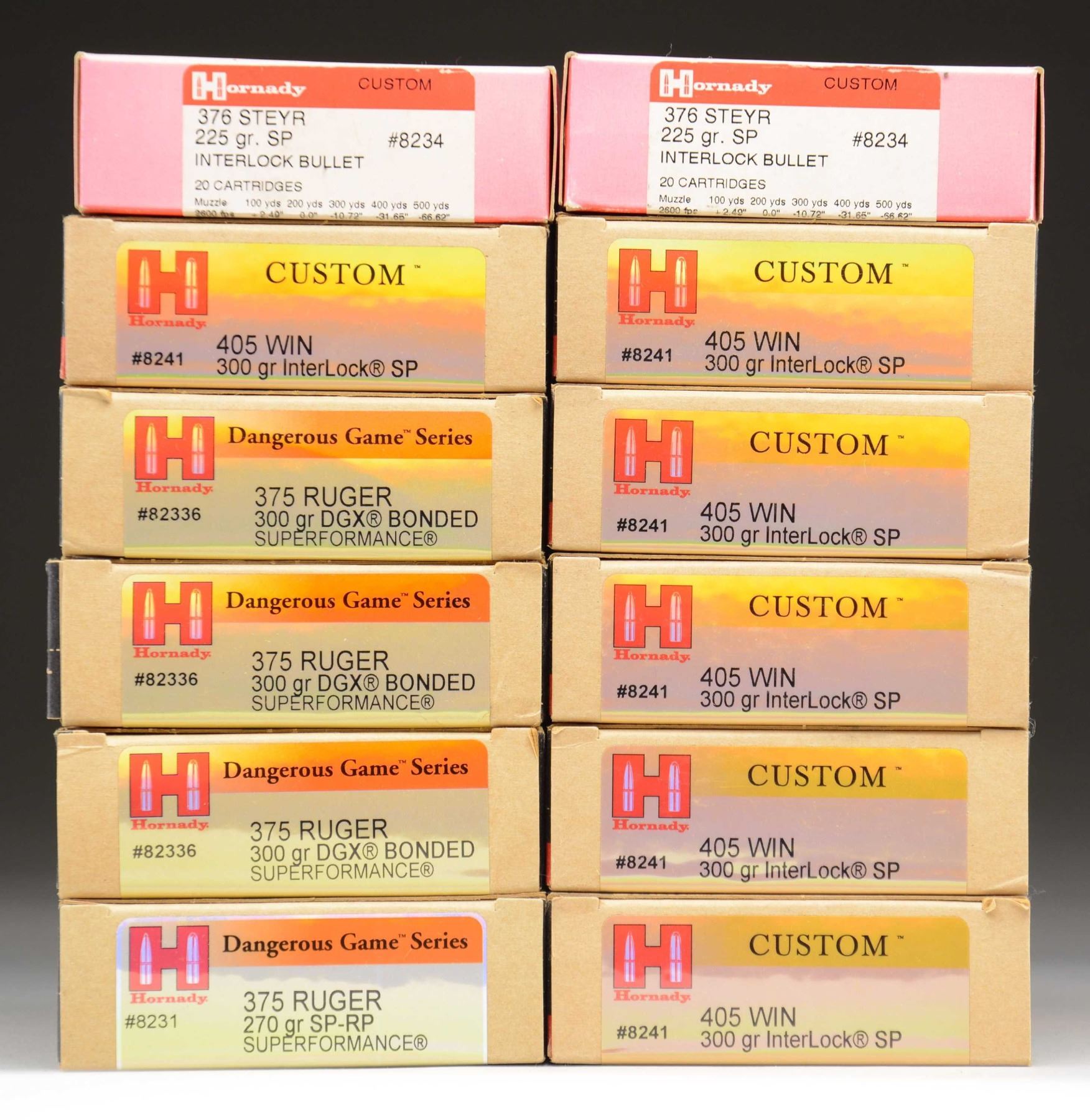 This lot consists of the following Hornady sporting rifle ammo: 1) 40 rds. (Two boxes) of 225 gr softpoint 376 Steyr. 2) 80 rds. (Four boxes) of varied weight Hornady Dangerous Game 375 Ruger ammo. 3) 120 rds. (Six boxes) of Hornady 300 gr. Interlock 405 Win ammo. CONDITION: ammo rates very good plus to near excellent overall. PROVENANCE: The Collection of Gun Sport Ltd owned by Jon R. Thomas. (02-20579/MJC). $500-700 for lot.