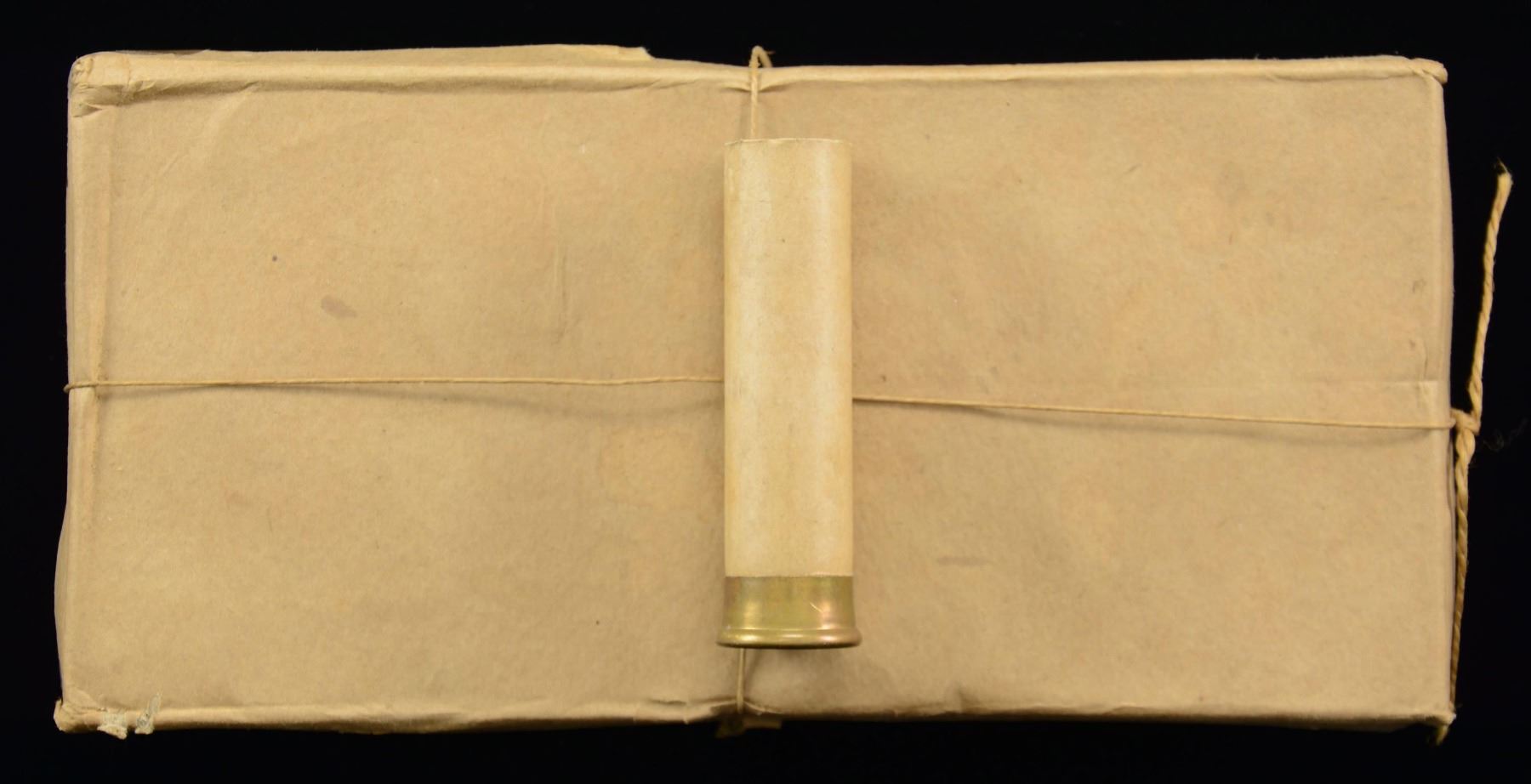 SHELLS. 1 box of 50 empty 4 GA paper shotgun shells, with 1 loose rd. Loose rd. is marked "J.P.&S./ V". CONDITION: excellent, with box exhibiting some mild exterior wear from handling and storage. Brass on loose rd. exhibits age related discoloration, but otherwise remains sturdy and serviceable. (02-23180/MLW). $100-150.