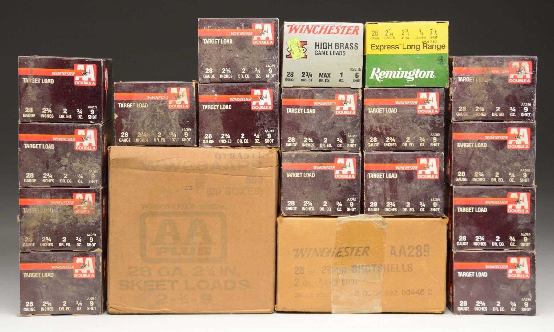 Lot of primarily Winchester 28 GA ammunition, including: 1) 25 25-rd. boxes (625-rds. total) of Winchester Double A Target Load 28 GA, 2 3/4", 9 shot ammunition. 1 sealed 500-rd. box (containing 20 25-rd. boxes) of Winchester AA Plus Skeet Load 28 GA, 2 3/4", 9 shot ammunition. 3) 1 25-rd. box of Winchester High Brass Game Loads 28 GA, 2 3/4", 6 shot ammunition. 4) 1 25-rd. box of Remington Express Long Range 28 Ga, 2 3/4", 7 1/2 shot ammunition. CONDITION: boxes exhibit varying degrees of wear, with all appearing to remain sturdy and serviceable. Ammunition shows some age related discoloration, but otherwise appears serviceable. (02-23110-8/MLW). $300-500.