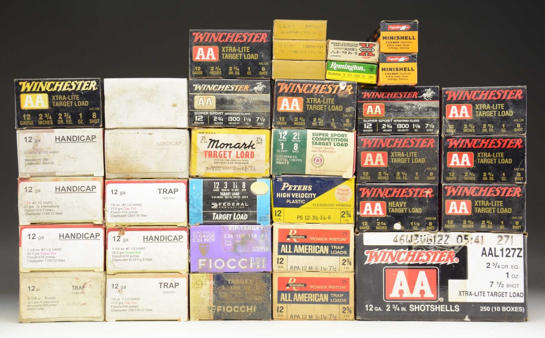 Lot of assorted 12 GA ammunition, including: 1) 1 250-rd. box (containing 10 25-rd. boxes) of Winchester Xtra-Lite Target Load 12 GA, 2 3/4", 7 1/2 Shot ammunition. 2) 7 25-rd. boxes (1 box with approx. 23-rds. remaining, approx. 173-rds. remaining) of Winchester Xtra-Lite Target Load 12 GA, 2 3/4", 8 shot ammunition. 3) 2 25-rd. boxes (50-rds. total) of Winchester Super Sport Sporting Clays 12 GA, 2 3/4", 7 1/2 shot ammunition. 4) 3 25-rd. boxes (75-rds. total) of assorted Estate 12 GA Trap ammunition. 5) 5 25-rd. boxes (1 box with approx. 20-rds. remaining, approx. 120-rds. remaining) of assorted Estate 12 GA Handicap ammunition. 6) 1 25-rd. box of Federal Target Load 12 GA 8 shot ammunition. 7) 1 vintage 25-rd. box of Federal Ammunition Monark Target Load 12 GA ammunition. 8) 3 5-rd. boxes (1 box with 3-rds. remaining, 13-rds. total) of Federal Hi-Power 12 GA, 2 3/4" Buckshot ammunition. 9) 1 25-rd. box of Remington "Power Piston" 12 GA, 2 3/4", 7 1/2 shot ammunition. 10) 1 5-rd. box of Remington 12 GA, 2 3/4" buckshot ammunition. 11) 2 20-rd. boxes (40-rds. total) of Aguila 12 GA, 1 3/4", 7 1/2 shot minishell ammunition. 12) 1 25-rd. box of Peters "Power Piston" 12 GA, 2 3/4" ammunition. 13) 1 unmarked box containing 25-rds. of Remington 12 GA ammunition. 14) 1 5-rd. box of Western Super X 12 GA, 2 3/4" buckshot ammunition. 15) 5 assorted partial boxes of 12 GA ammunition. CONDITION: boxes exhibit varying degrees of wear and tear, with most remaining sturdy and serviceable. Ammunition shows some age related discoloration, but otherwise appears serviceable. (02-23110-7/MLW). $300-500.