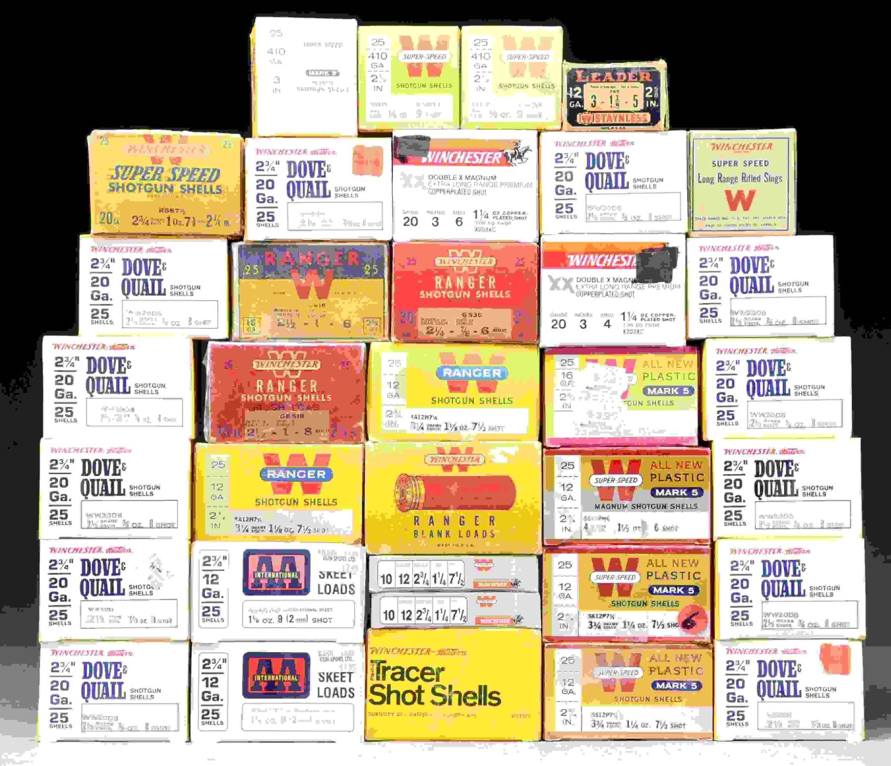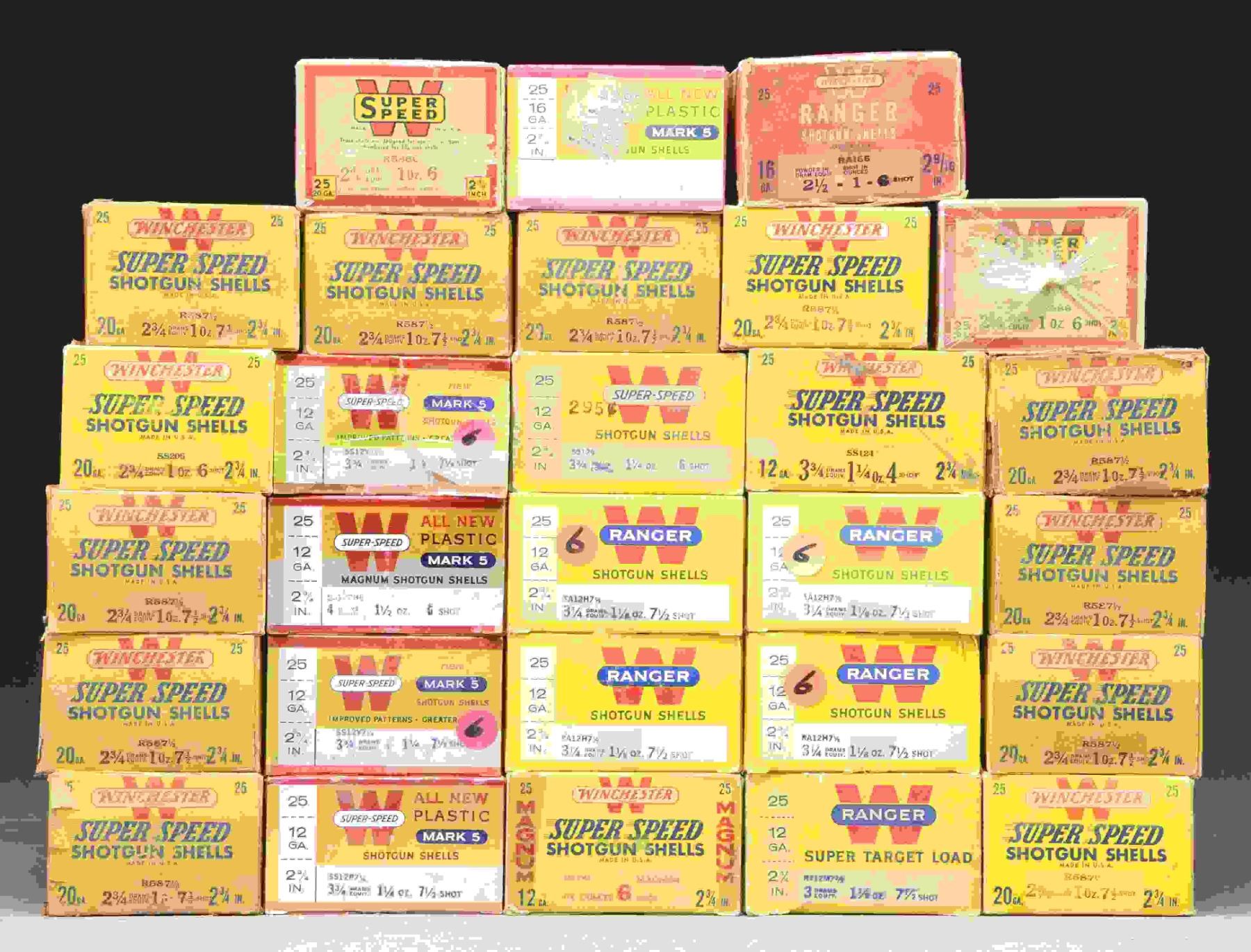 AMMUNITION. Large lot of primarily vintage Winchester shotgun ammunition, including: 1) 1 25-rd. box of Winchester .410 GA (RS93) 2 1/2" MAX-93 grain rifled slug ammunition. 2) 2 25-rd. boxes (50-rds. total) of Winchester Super Speed (SS419) .410 GA 2 1/2" skeet ammunition. 3) 1 25-rd. box of Winchester Ranger (G616) 16 GA 2 9/16" 6 shot ammunition. 4) 1 25-rd. box of Winchester Super Speed Mark V (SS16PH7 1/2) 16 GA, 2 3/4" 7 1/2 shot ammunition. 5) 1 25-rd. box (approx. 18-rds. remaining) of Winchester Ranger (RA166) 16 GA, 2 9/16" 6 shot ammunition. 6) 1 25-rd. box of Winchester Ranger (GB618) 16 GA 2 3/4" 8 shot Brush Load ammunition. 7) 1 25-rd. box (approx. 24-rds. remaining) of Winchester Super Speed (R586) 20 GA, 2 3/4" 6 shot ammunition. 8) 1 25-rd. box of Winchester Super Speed (R5860) 20 GA, 2 3/4" 6 shot ammunition. 9) 1 25-rd. box (approx. 23-rds. remaining) of Winchester Ranger (G536) 20 GA, 2 3/4" 6 shot ammunition. 10) 1 25-rd. box of Winchester Super Speed (SS206) 20 Ga, 2 3/4" 6 shot ammunition. 11) 11 25-rd. boxes (approx. 265-rds. remaining) of Winchester Super Speed (R587 1/2) 20 Ga, 2 3/4" 7 1/2 shot ammunition. 12) 2 25-rd. boxes (50-rds. total) of Winchester Double X Magnum (X203XC) 20 GA, 3" 4 shot, copper plated shot ammunition. 13) 12 25-rd. boxes (approx. 285-rds. remaining) of Winchester Dove & Quail (WW20D8) 20 GA, 2 3/4" 8 shot ammunition. 14) 1 10-rd. box of Winchester Leader 12 GA, 2 5/8" ammunition. 15) 1 25-rd. box of Winchester Ranger Super Target Load (RT12M7 1/2) 12 GA, 2 3/4" 7 1/2 shot ammunition. 16) 1 25-rd. box of Winchester Super Speed Magnum (SS12H6) 12 GA, 2 3/4" 6 shot ammunition. 17) 1 25-rd. box of Winchester Super Speed (SS124) 12 GA, 2 3/4" 4 shot ammunition. 18) 1 25-rd. box of Winchester Super Speed (SS126) 12 GA, 2 3/4" 6 shot ammunition. 19) 1 25-rd. box (approx. 15-rds. remaining) of Winchester (WT12PT) 12 GA, 2 3/4" tracer shot shells. 20) 2 25-rd. boxes (50-rds. total) of Winchester Super Speed (SS12V7 1/2) 12 GA, 2 3/4" 7 1/2 shot ammunition. 21) 2 25-rd. boxes (50-rds. total) of Winchester Super Speed Mark 5 (SS12P7 1/2) 12 GA, 2 3/4" 7 1/2 shot ammunition. 22) 2 25-rd. boxes (50-rds. total) of Winchester Super Speed Mark 5 (SS12PH6) 12 GA, 2 3/4" 6 shot ammunition. 23) 1 25-rd. box of Winchester Super Speed Mark 5 (SS12P7 1/2) 12 GA, 2 3/4" 7 1/2 shot ammunition. 24) 2 25-rd. boxes (50-rds. total) of Winchester Double A Skeet Loads (WWAA12IS9) 12 GA, 2 3/4" 2mm shot ammunition. 25) 2 10-rd. boxes (20-rds. total) of Winchester Super Speed Paper 12 GA, 2 3/4" 7 1/2 shot ammunition. 26) 6 25-rd. boxes (150-rds. total) of Winchester Ranger (RA12H7 1/2) 12 GA, 2 3/4" 7 1/2 shot ammunition. 27) 1 25-rd. box of Winchester Ranger Blank Loads (RA10BL) 10 GA, 2 7/8" blank ammunition. 28) 1 25-rd box of Winchester Super Speed Mark 5 (# obscured) 16 GA, 2 3/4" 7 1/2 shot ammunition. 29) 1 25-rd. box (box no longer serviceable) of Winchester Super Speed 16 GA, No. 20 ammunition. CONDITION: Ammunition exhibits age related discoloration and some spots of verdigris, but otherwise appears sturdy and serviceable. Boxes exhibit varying degrees of wear, age related discoloration, as well as tearing. PROVENANCE: The Collection of Gun Sport Ltd owned by Jon R. Thomas. (02-20535/MLW). $600-1,000.