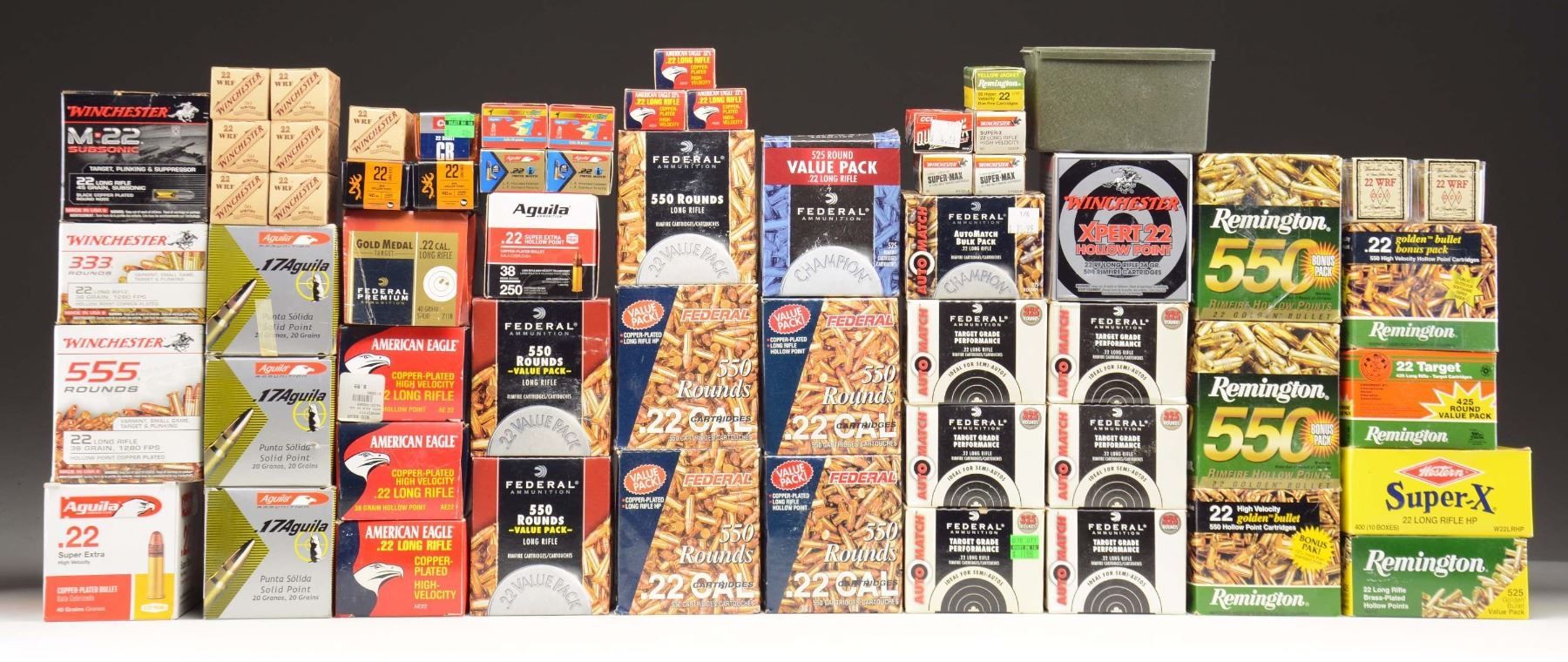 Large lot of primarily assorted .22 LR ammunition, including: 1) 1 550-rd. box of Federal Premium Gold Target .22 LR 40 grain ammunition. 2) 7 325-rd. boxes (2,275-rds. total) of Federal .22 LR 40 grain ammunition. 3) 8 550-rd. boxes (4,400-rds. total) of Federal .22 LR 36 grain Hollow Point ammunition. 4) 3 400-rd. boxes & 3 40-rd. boxes(1,320-rds. total) of American Eagle Copper Plated .22 LR 38 grain Hollow Point ammunition. 5) 4 550-rd. boxes (2,200-rds. total) of Remington Golden Bullet .22 LR 36 grain Hollow Point ammunition. 6) 1 525-rd. box of Remington Golden Bullet .22 LR 36 grain Hollow Point ammunition. 7) 1 425-rd. box of Remington Target .22 LR 40 grain Lead Round Nose ammunition. 8) 1 50-rd. box of Remington Yellow Jacket .22 LR Hyper Velocity 33 grain Truncated Conical Hollow Point ammunition. 9) 888-rds. (1 333-rd. box and 1 555-rd. box) of Winchester .22 LR 36 grain Copper Plated Hollow Point ammunition. 10) 1 500-rd. box of Winchester XPERT .22 LR 36 grain Hollow Point ammunition. 11) 1 400-rd. box of Winchester M22 Subsonic .22 LR 45 grain Black Cooper Plated Round Nose ammunition. 12) 2 50-rd. boxes (100-rds. total) of Winchester SUPER-MAX .22LR 34 grain Lead Hollow Point ammunition. 13) 1 50-rd. box of Winchester SUPER-X .22 LR 40 grain Lead ammunition. 14) 7 50-rd. boxes (350-rds. total) of Winchester 1986 Limited Edition .22 WRF 45 grain Lead ammunition. 15) 1 400-rd. box of Western SUPER-X .22LR 40 grain Copper Plated Hollow Point ammunition. 16) 1 small green plastic CCI ammo box (containing approximately 300-rds.) of .22 LR Copper Plated Round Nose ammunition. 17) 1 50-rd. box of CCI QUIK-SHOK ammunition. 18) 1 plastic case of CCI .22 Short CB 29 grain ammunition. 19) 2 50-rd. plastic cases (100-rds. total) of CCI .22 WRF 45 grain Hollow Point ammunition. 20) 2 100-rd. plastic cases (200-rds. total) of Browning .22 LR BPR 40 grain Hollow Point ammunition. 21) 1 500-rd. box of Aguila .22 LR 40 grain Copper Plated Round Nose ammunition. 22) 2 50-rd. boxes (100-rds. total) of Aguila .22 LR 40 grain Pistol Match ammunition. 23) 2 50-rd. boxes(100-rds. total) of Aguila .22 Super Colibri 20 grain ammunition. 24) 3 500-rd. boxes (1,500-rds. total) of Aguila .17 Aguila 20 grain FMJ ammunition. CONDITION: ammunition all appears good and serviceable. Boxes exhibit varying degrees of wear, but otherwise remain sturdy and serviceable. (02-22867/MLW). $400-800.