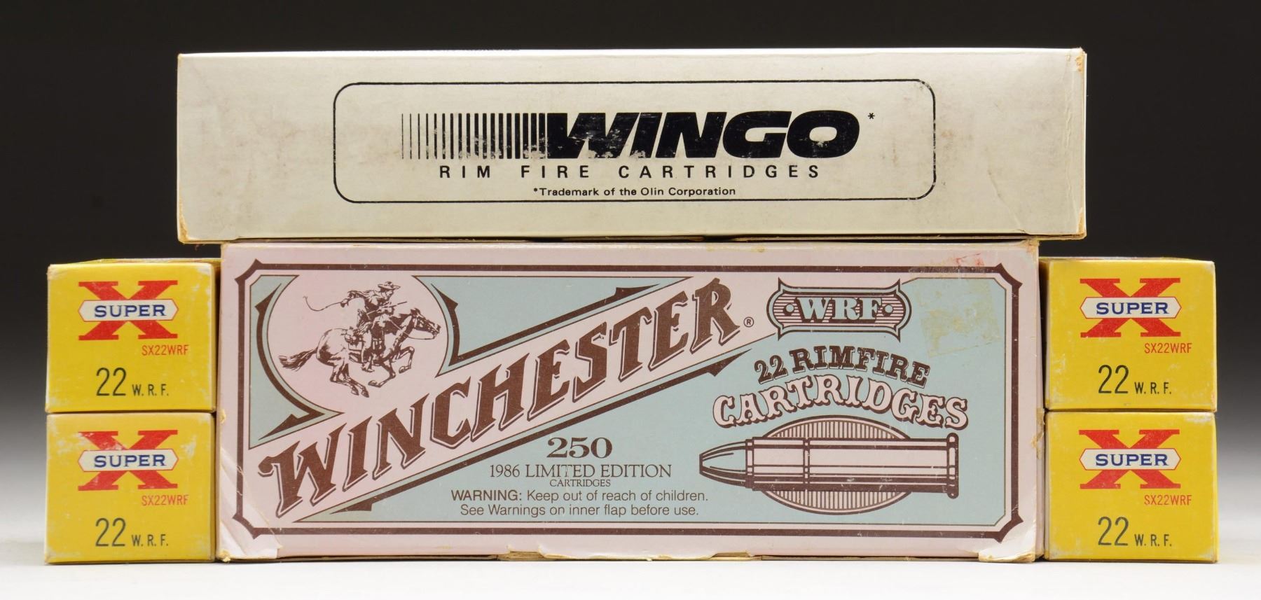 FIRE AMMUNITION. WINGO: The Winchester Wingo was a system developed to allow indoor shotgun shooting using a special .20 cal shot cartridge in a smooth bore lever action gun. The targets were 1 oz. 4" diameter ice balls. A Wingo facility was opened in San Diego Cal. but only lasted 1 year. The guns and ammunition are very scarce. .20 CAL. WINGO: 1 Sleeve of 150 containing 5 boxes of 30 packed loose. # 12 Shot. The cartridges are head stamped "W". The sleeve markings include "WG 5-30 and "WINGO". CONDITION: the sleeve and boxes have only very light handling wear. The ammunition appears clean and serviceable. 22WRF: This round was developed for the Winchester Model 1890 slide action rifle. 5 Boxes of 50 WESTERN SUPER X. Yellow and white boxes. / 1 Sleeve of 250 cartridges containing 5 50 round boxes WINCHESTER 1986 LIMITED EDITION. 45 Gr. lead bullets Lubaloy coated. Tan sleeve and boxes. CONDITION: the Western ammo has one faded box. Winchester ammo has moderate handling wear on the sleeve. All cartridges appear clean and serviceable. PROVENANCE: from The Collection of Gun Sport Ltd owned by Jon R. Thomas. (02-20538-2/ RW). $500-900.