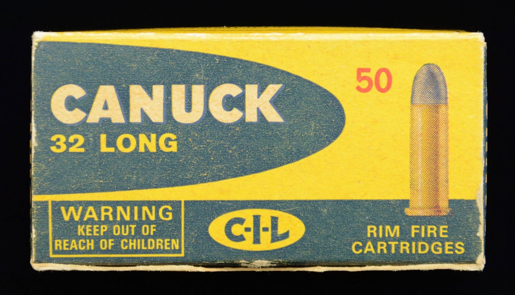AMMUNITION. Full vintage 50-rd. box of Canuck 80 grain .32 Long Rimfire ammunition. All rds. are present. CONDITION: box is very good, with some light exterior wear, as well as some age related discoloration overall. Lead projectiles exhibit varying degrees of oxidation, with casings exhibiting age related discoloration and some scattered spots of verdigris. (02-23285/MLW). $50-150.